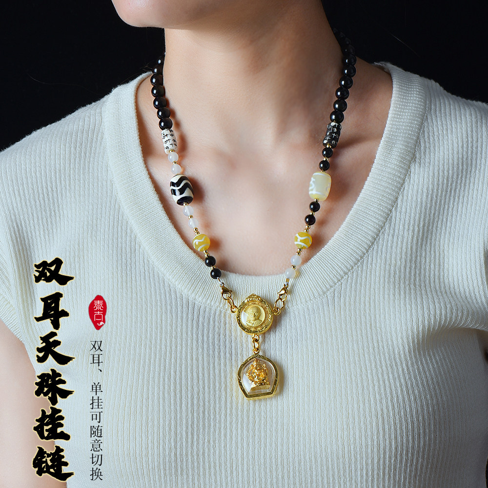 泰国佛牌链唐卡挂链8mm黑檀双耳天珠挂链毛衣链弹簧扣方便黄金链