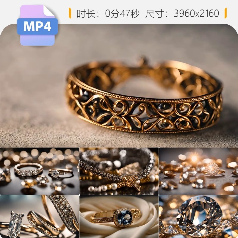 高清裸钻闪耀晶莹珠宝首饰合集黄金链镯奢侈婚庆玉珍展览视频素材