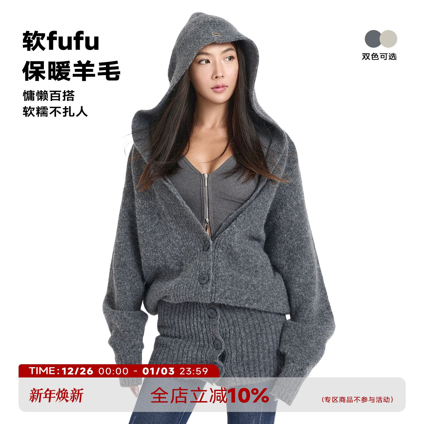 ABMY 羊毛连帽针织两穿中长款开衫秋冬宽松加厚保暖慵懒毛衣外套