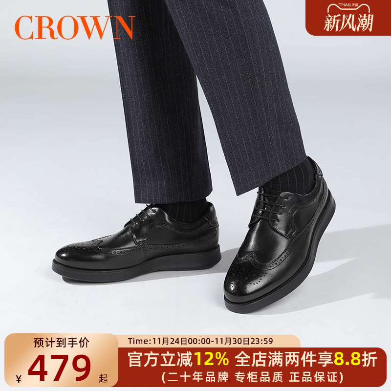 CROWN/皇冠商务皮鞋真皮轻质厚底德比鞋休闲圆头雕花布洛克男鞋