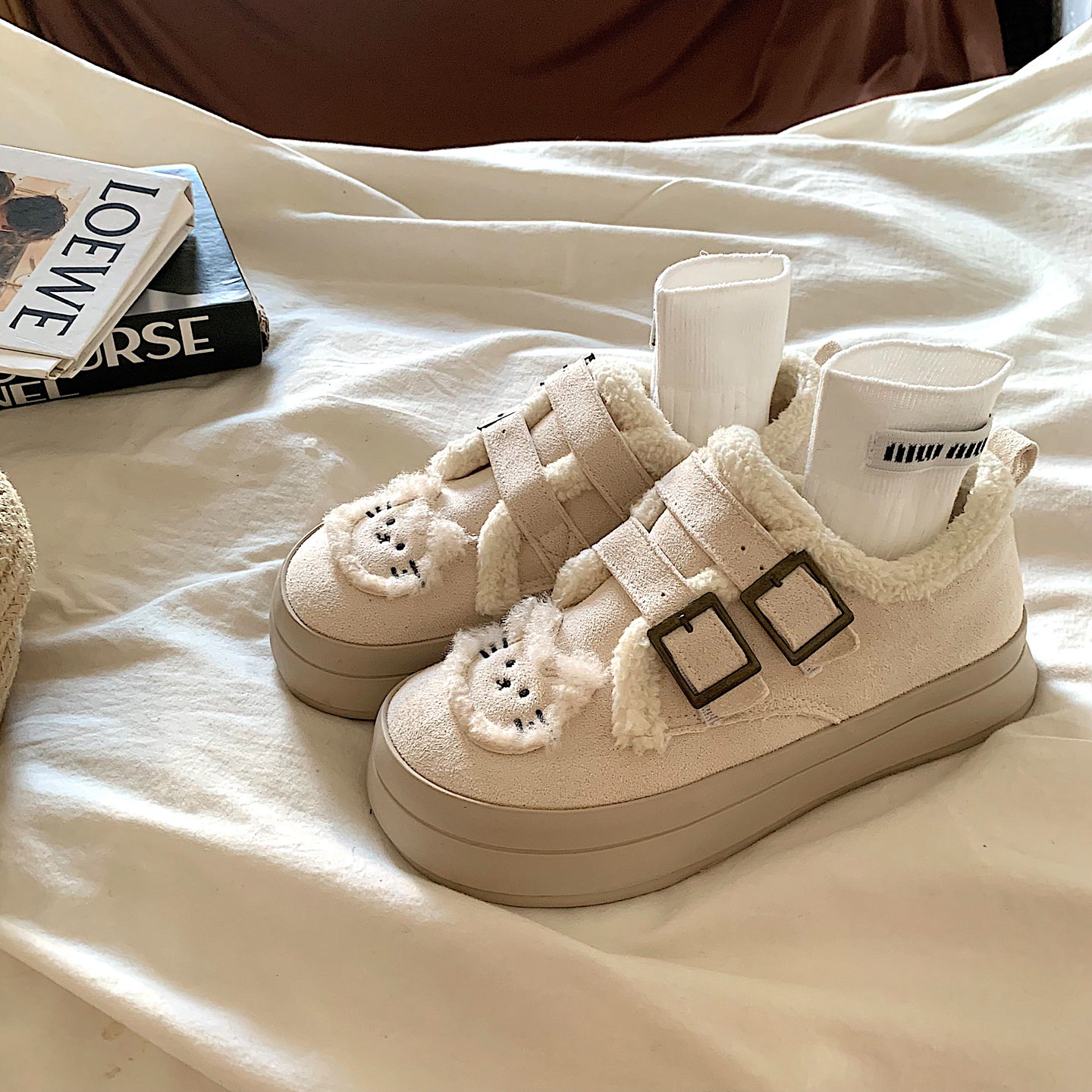 兔兔宋原创小众复古奶油白加绒小白鞋女冬季厚底百搭保暖棉鞋板鞋