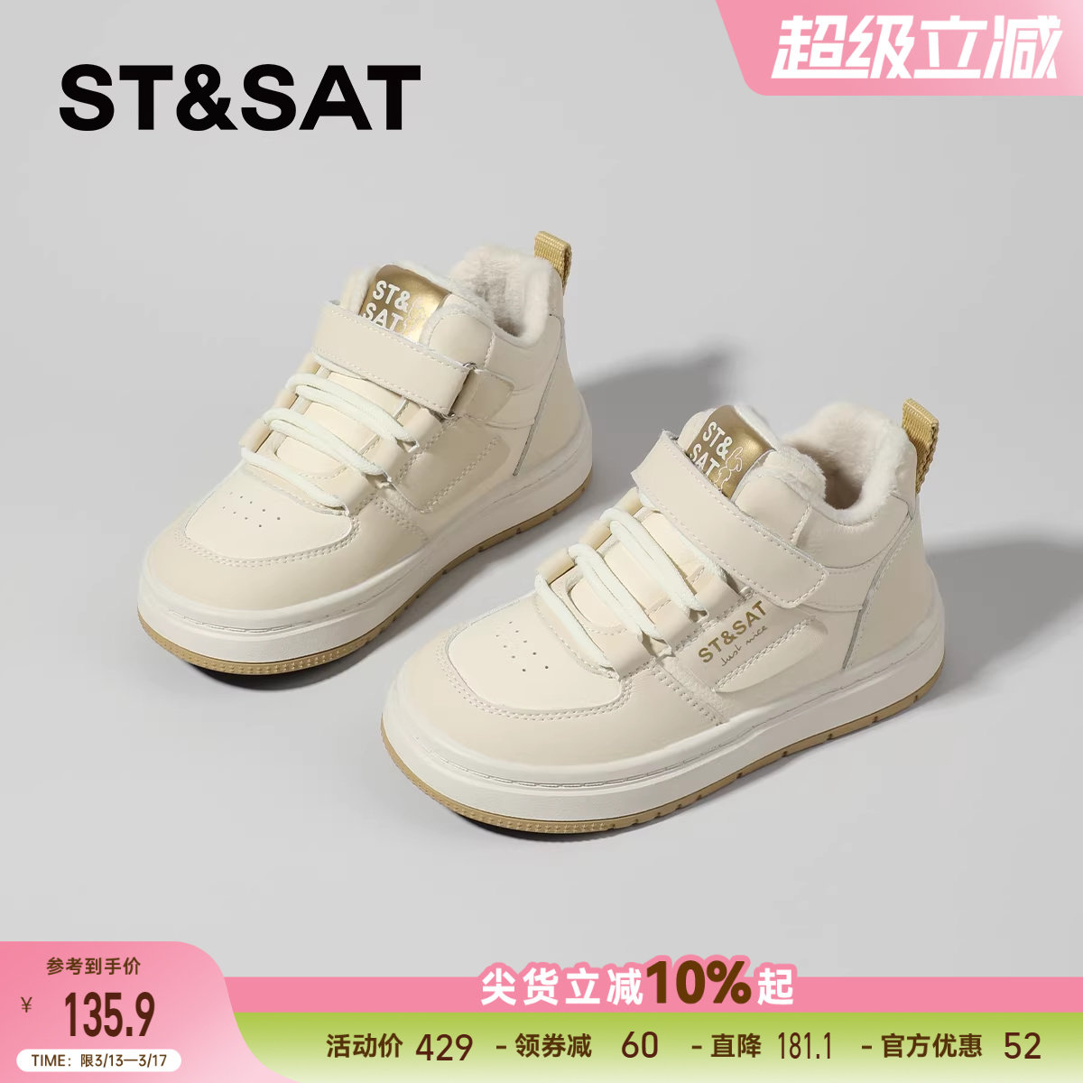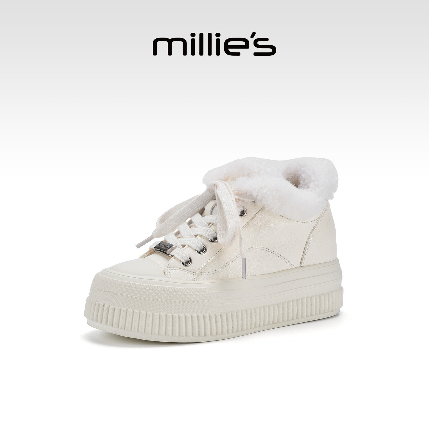 MILLIE'S/妙丽毛绒翻边厚底小白鞋女冬季保暖系带休闲板鞋Q