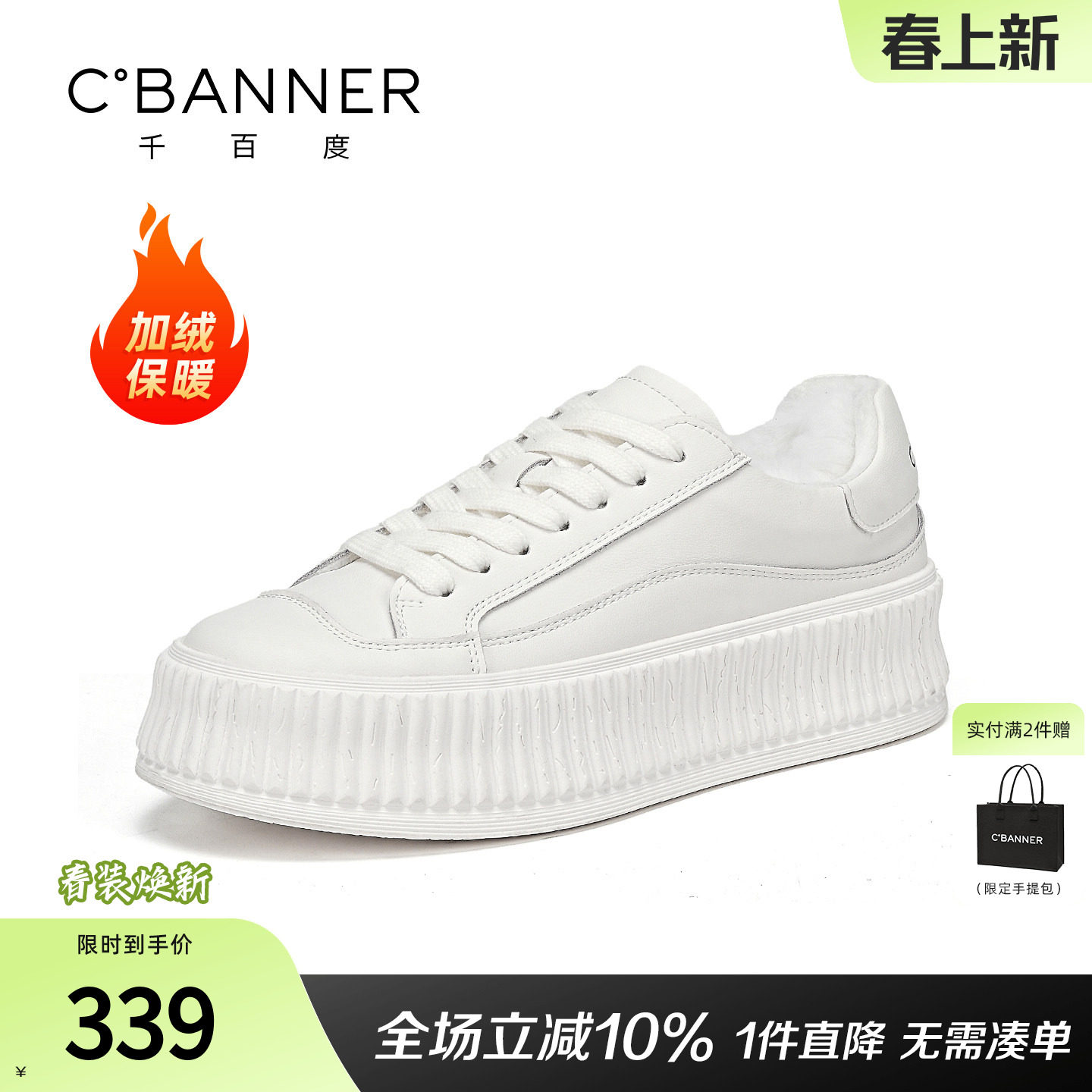 千百度厚底小白鞋女冬季系带松糕加绒棉鞋增高板鞋百搭运动休闲鞋