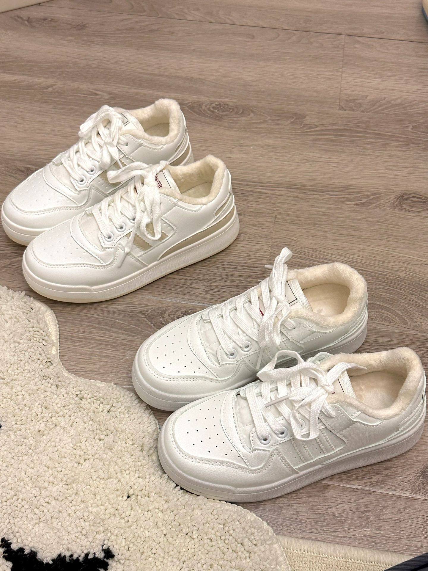 细细条 复古双杠小白鞋女冬季加绒加厚底保暖百搭休闲板鞋棉鞋ins