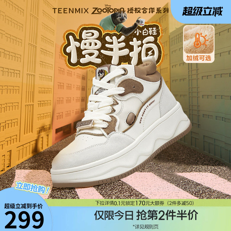 天美意疯狂动物城联名慢半拍小白鞋女冬新款高帮板鞋厚底增高短靴