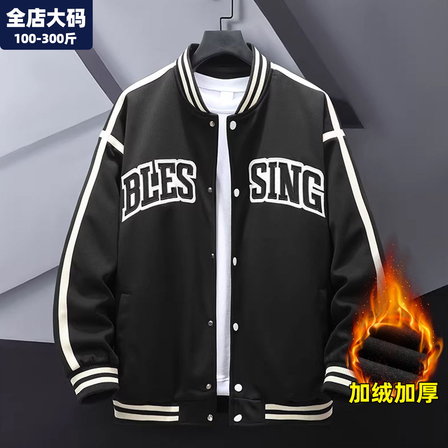 大码棒球服男秋冬季保暖加绒加厚夹克外套宽松青少年胖子加肥加大