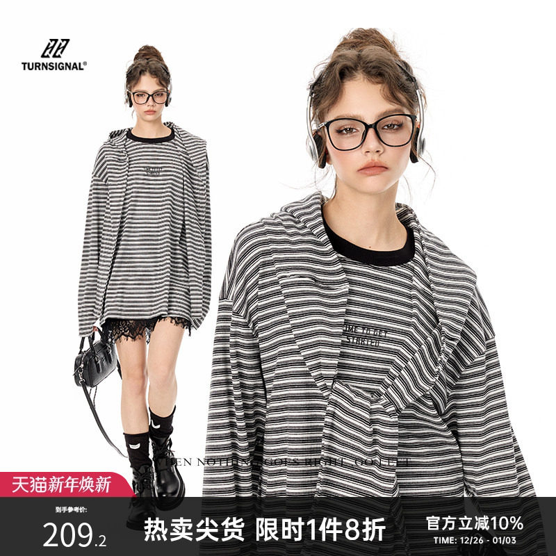TurnSignal潮牌中长款条纹T恤女2025新款休闲宽松遮屁股长袖T恤裙