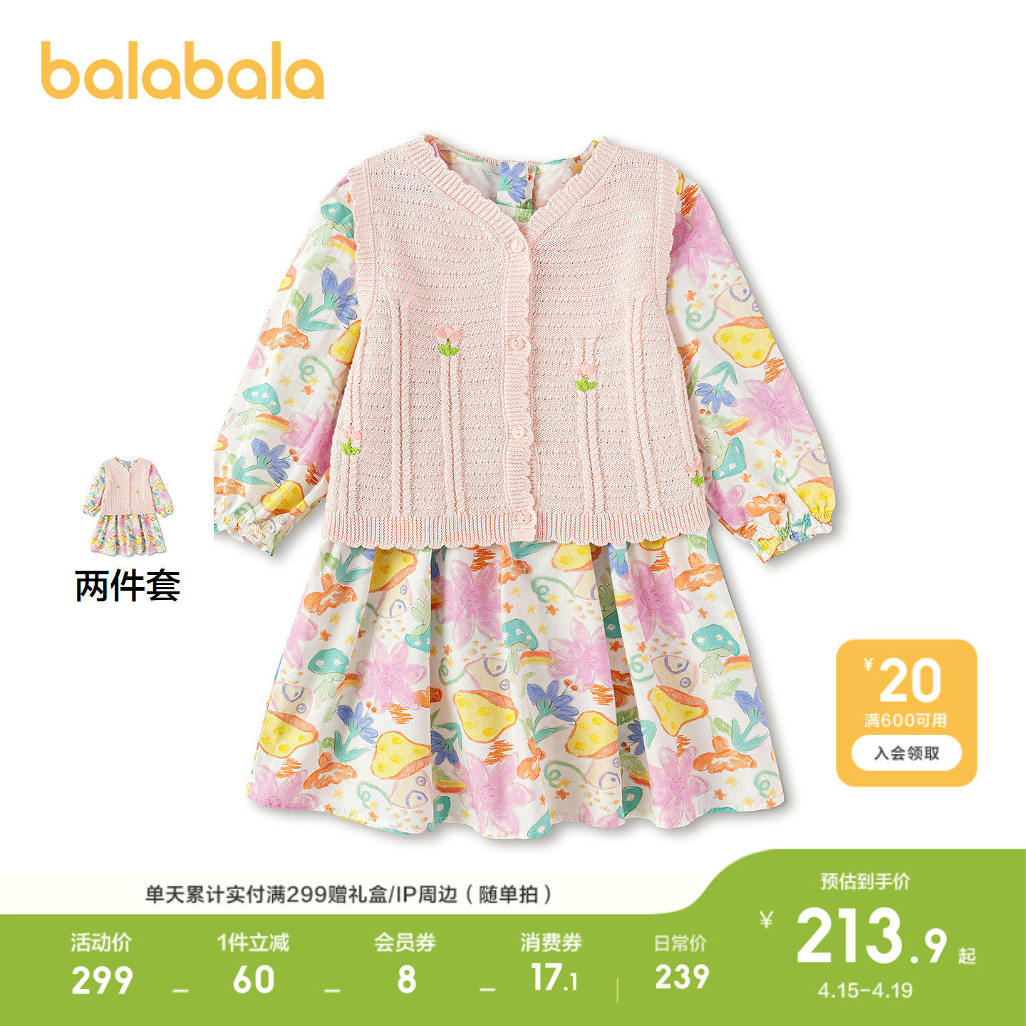 巴拉巴拉童装女童连衣裙儿童2026春秋新款两件套裙子甜马甲连衣裙