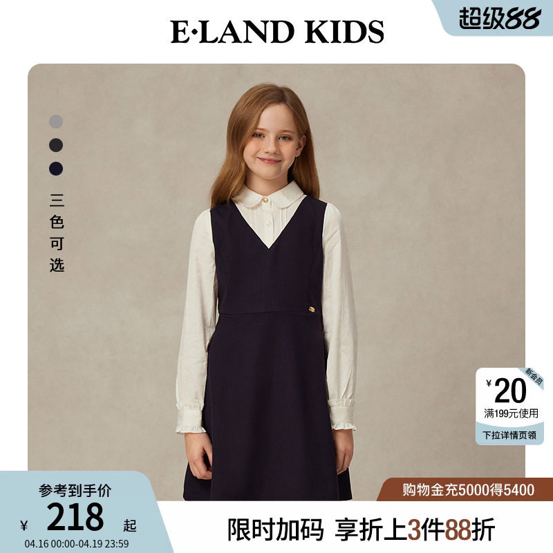 eland kids衣恋童装女童连衣裙春秋休闲学院风花苞袖假两件裙子