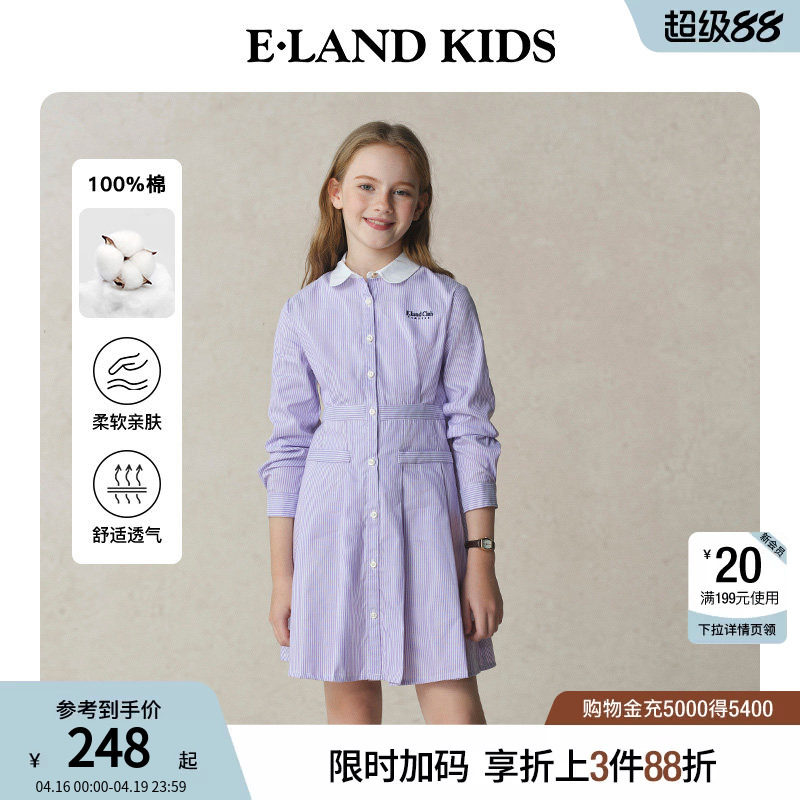 【100%棉】eland kids衣恋童装女童连衣裙春秋条纹撞色翻领衬衫裙