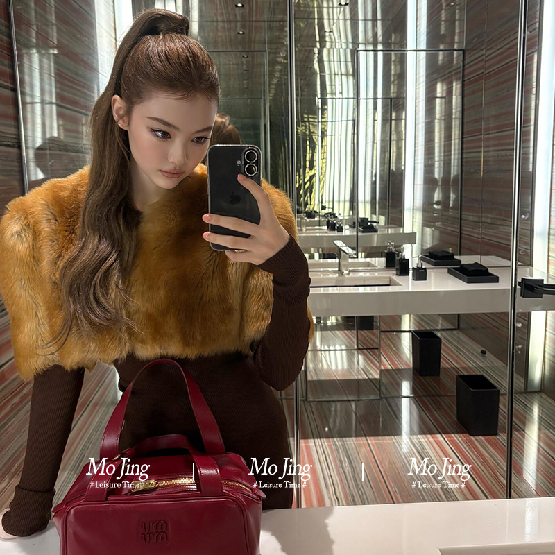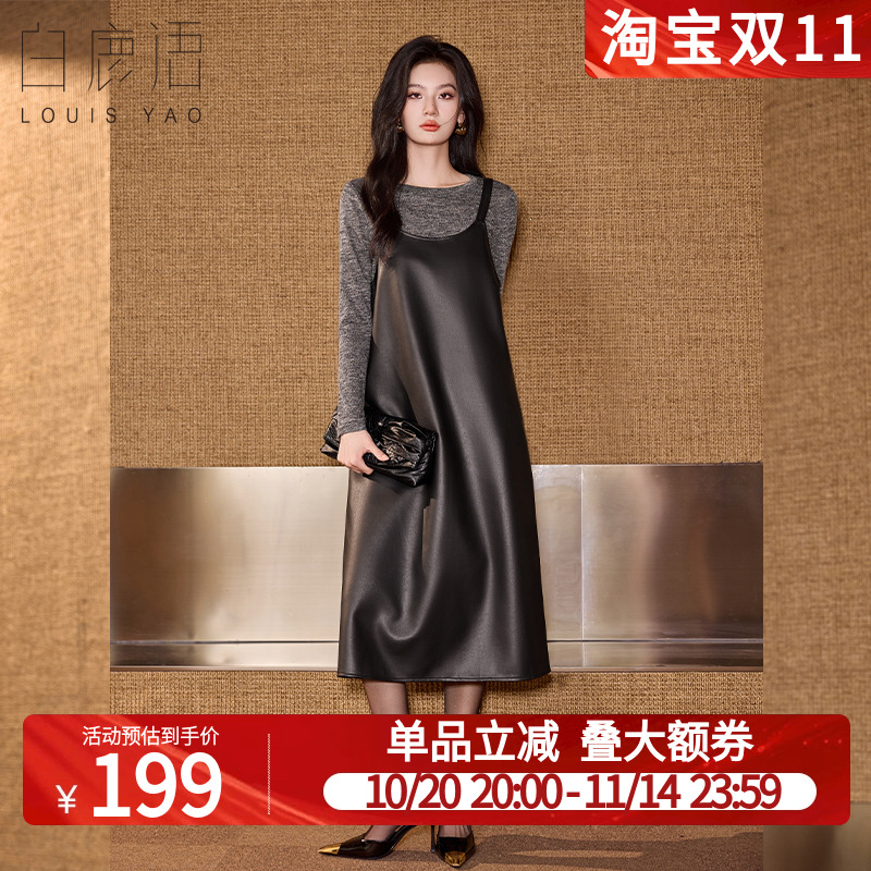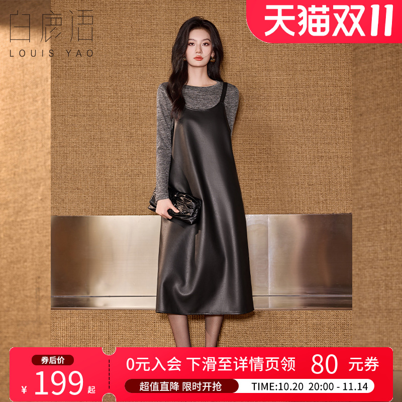 白鹿语时尚两件套25秋冬款夹花色针织T恤衫仿皮背带长裙套装女
