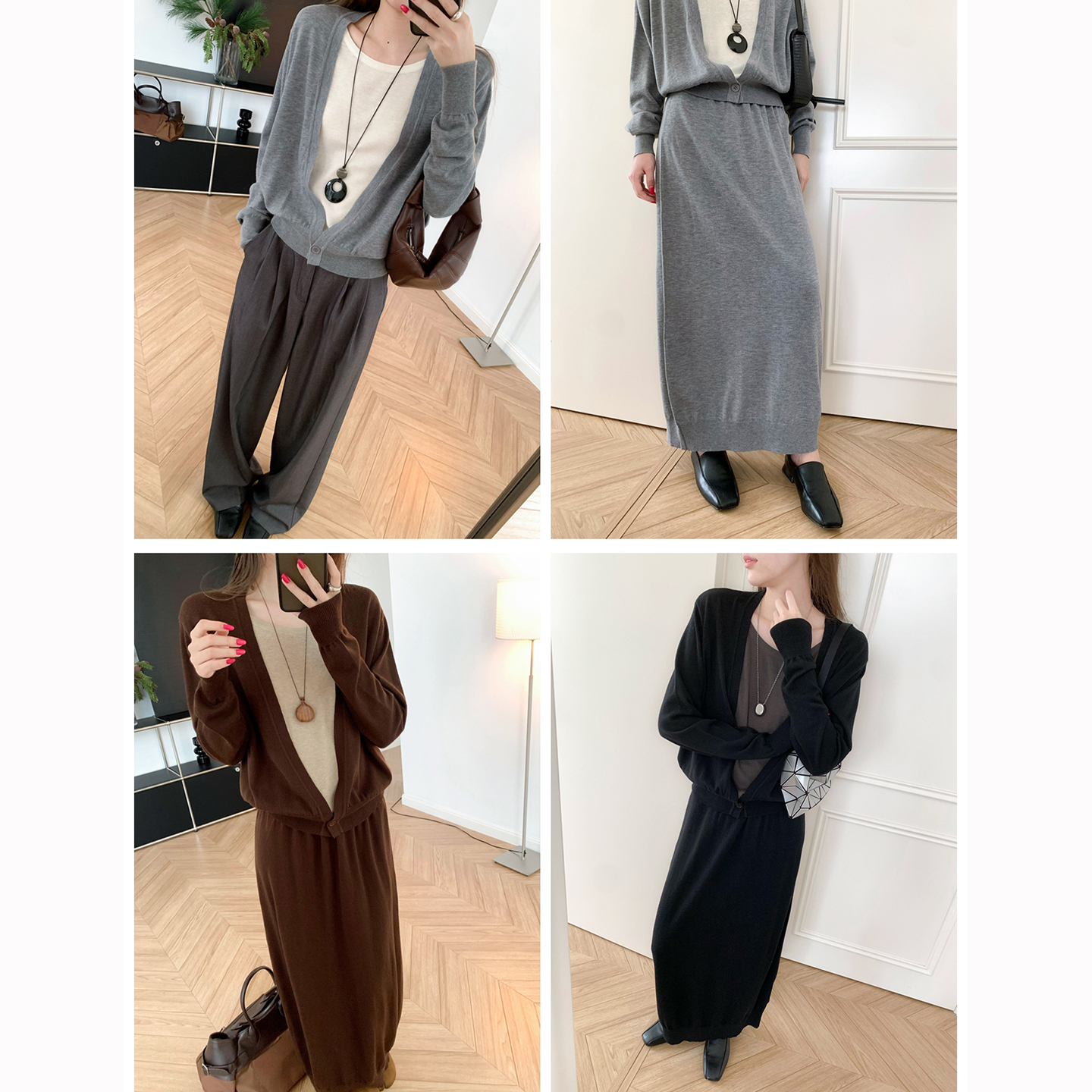 省心懒人套装 秋冬V领假两件针织衫长袖+罗纹半身裙中长裙两件套