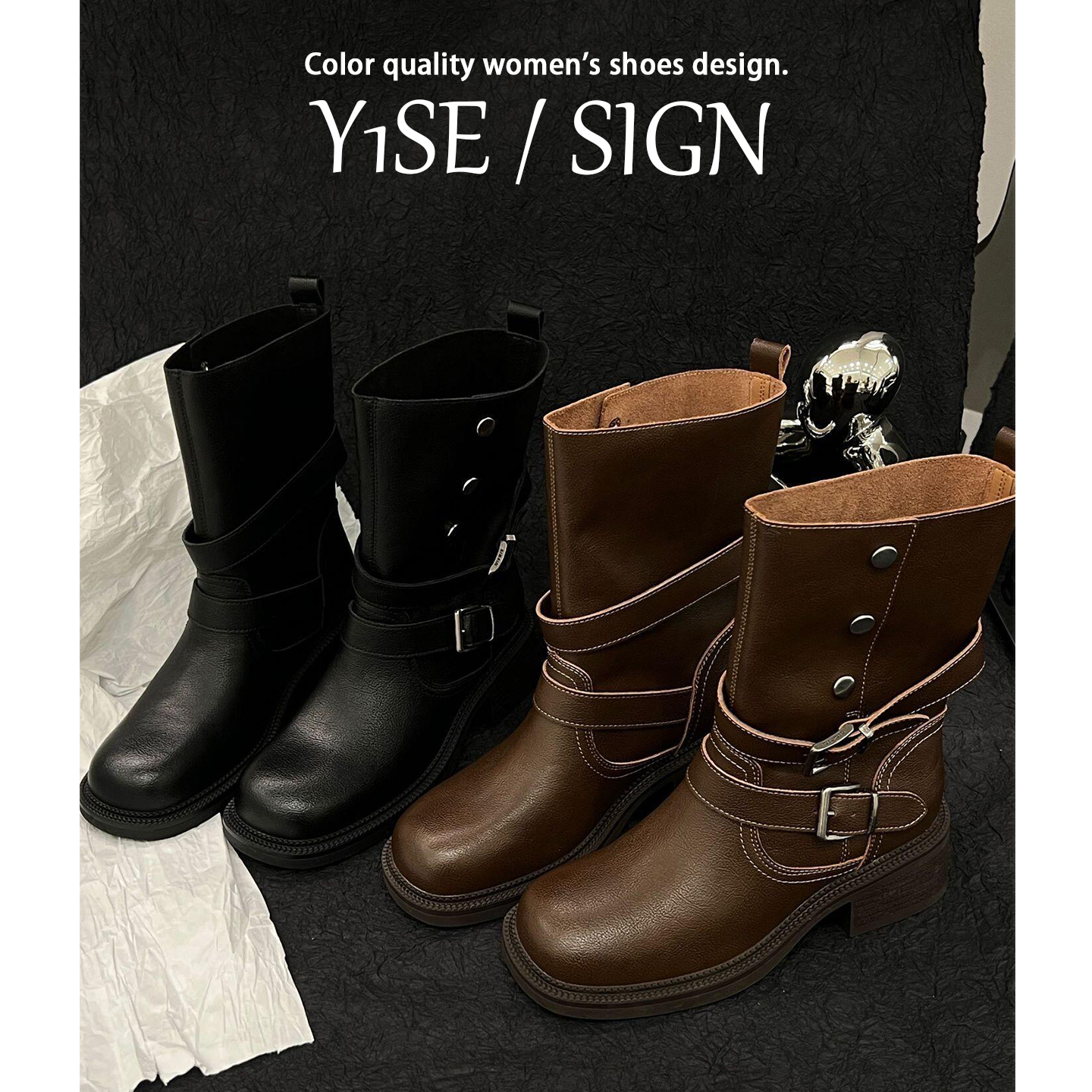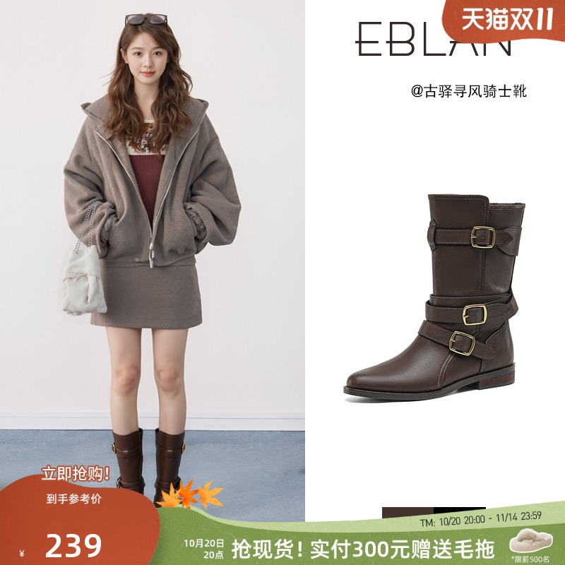 EBLAN/伊伴粗跟厚底英伦风马丁靴女2025秋季新款复古短靴中筒靴子
