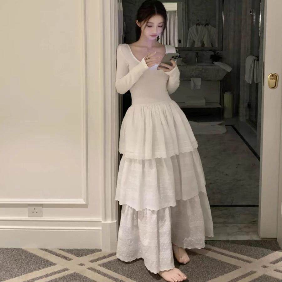 超甜芭蕾风~25秋U领锁骨长袖修身层层大摆连衣裙收腰蓬蓬温柔长裙