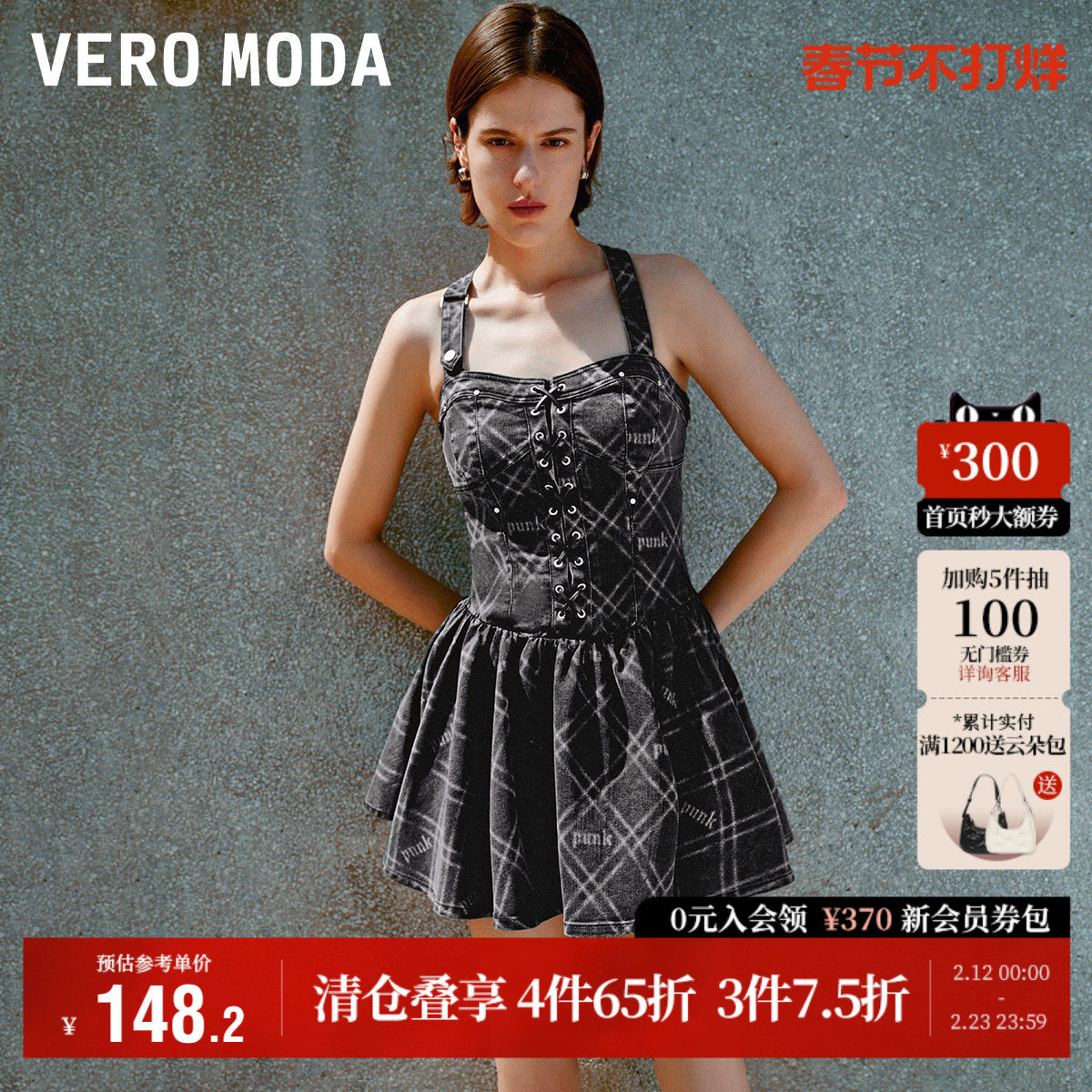Vero Moda奥莱连衣裙夏季新款吊带牛仔绑带蓬蓬修身百褶短裙子