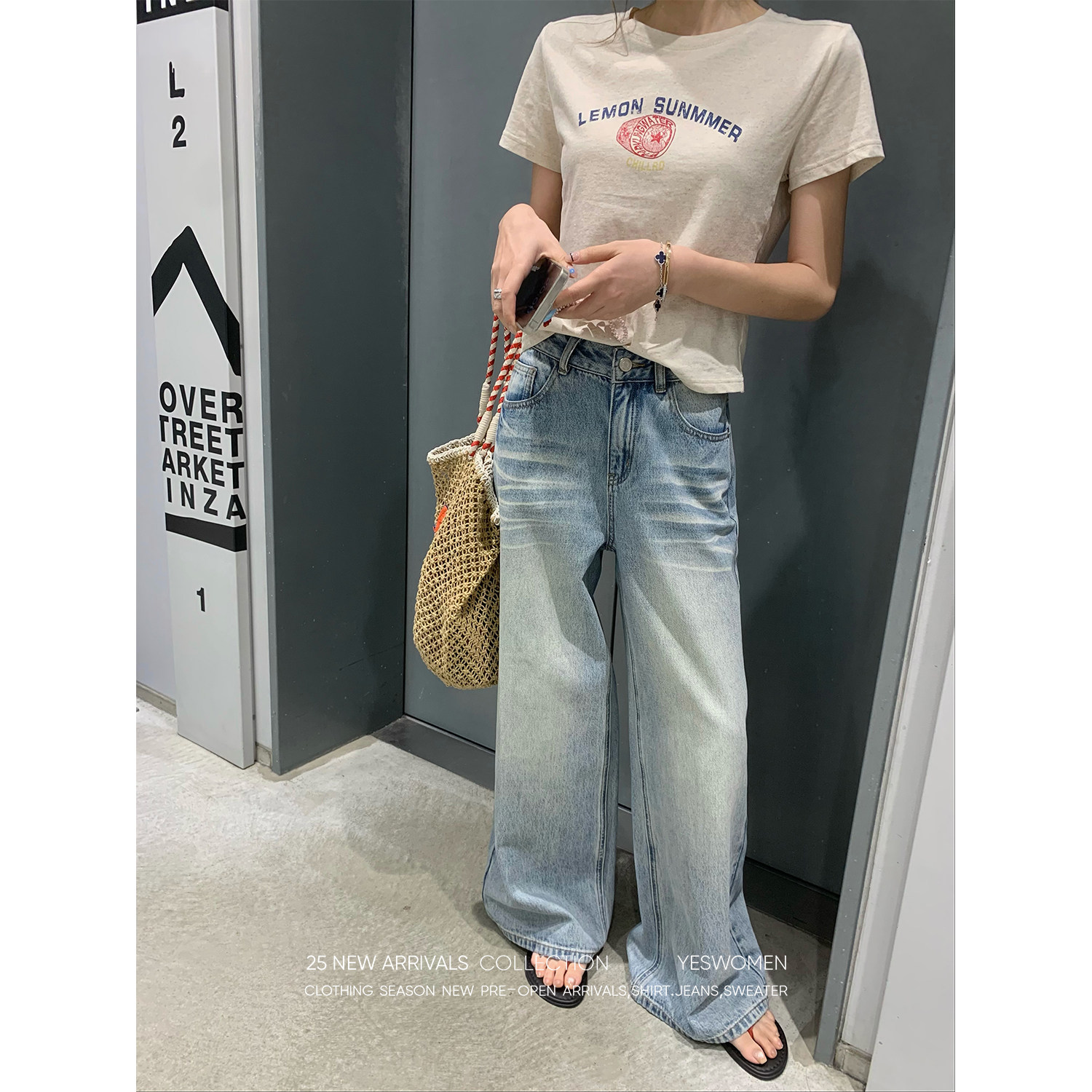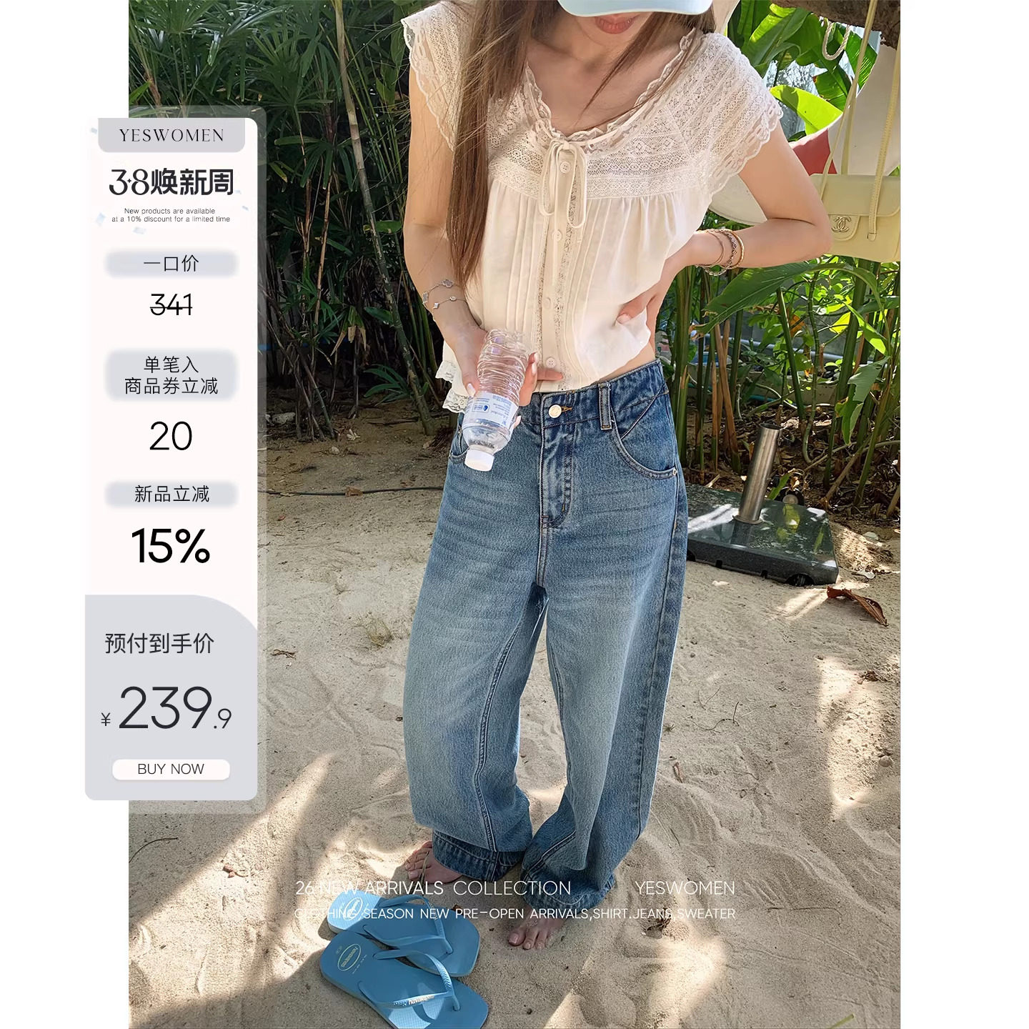 小宜定制 加州流浪浅牛·夏季新款高腰阔腿宽松蓝色水洗牛仔裤女