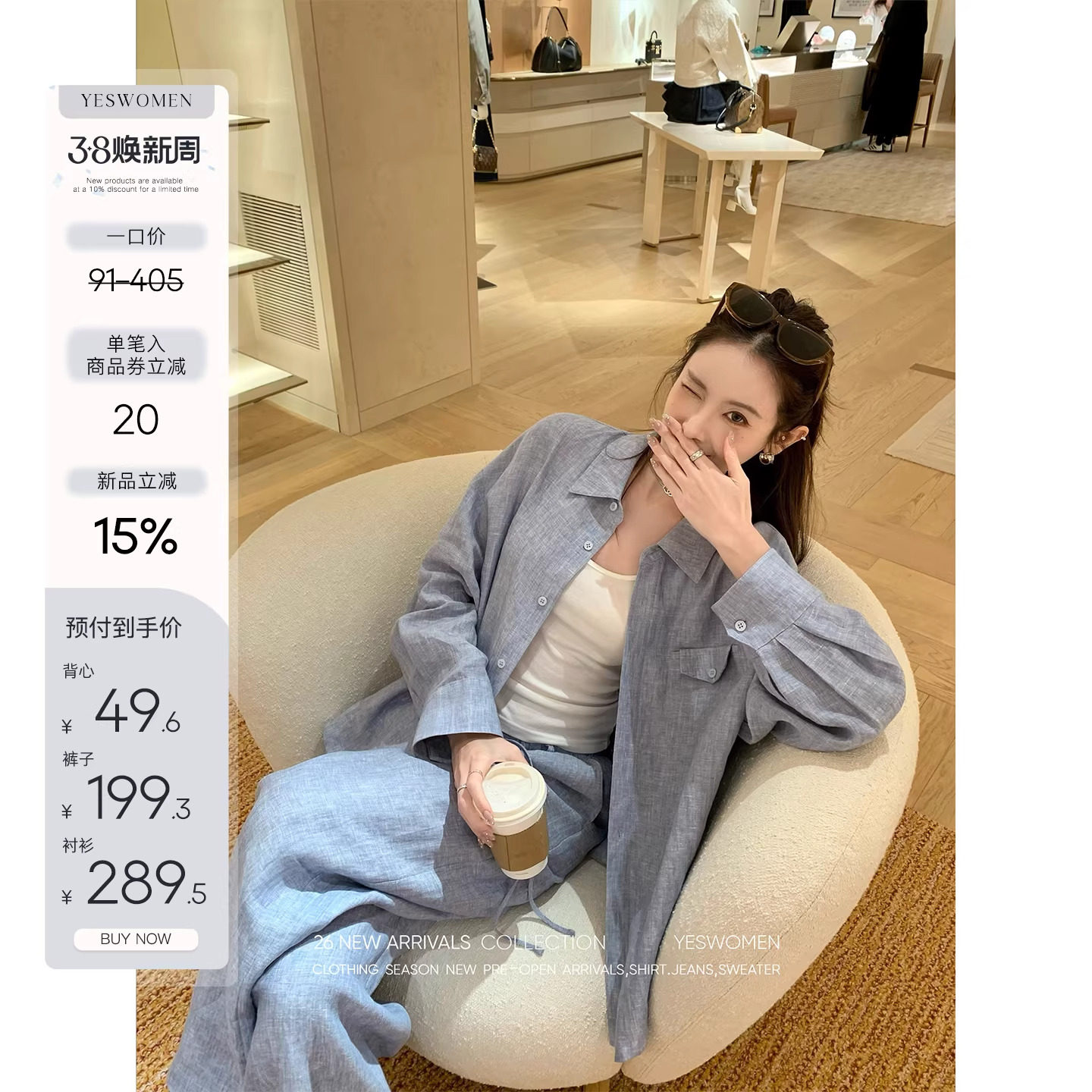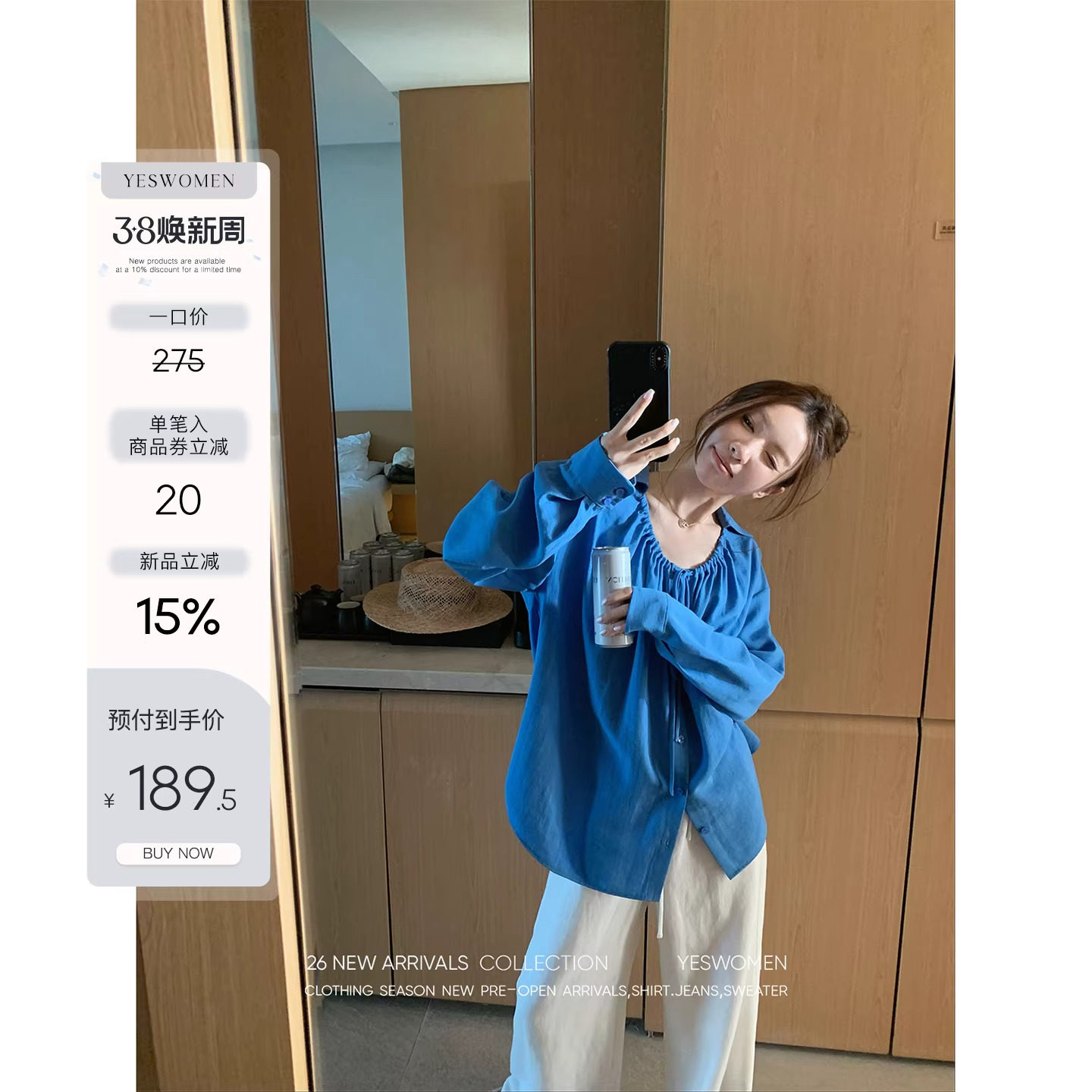 小宜定制 老钱亚麻outfit·春夏新款蓝色白色长袖衬衫女衬衣上衣