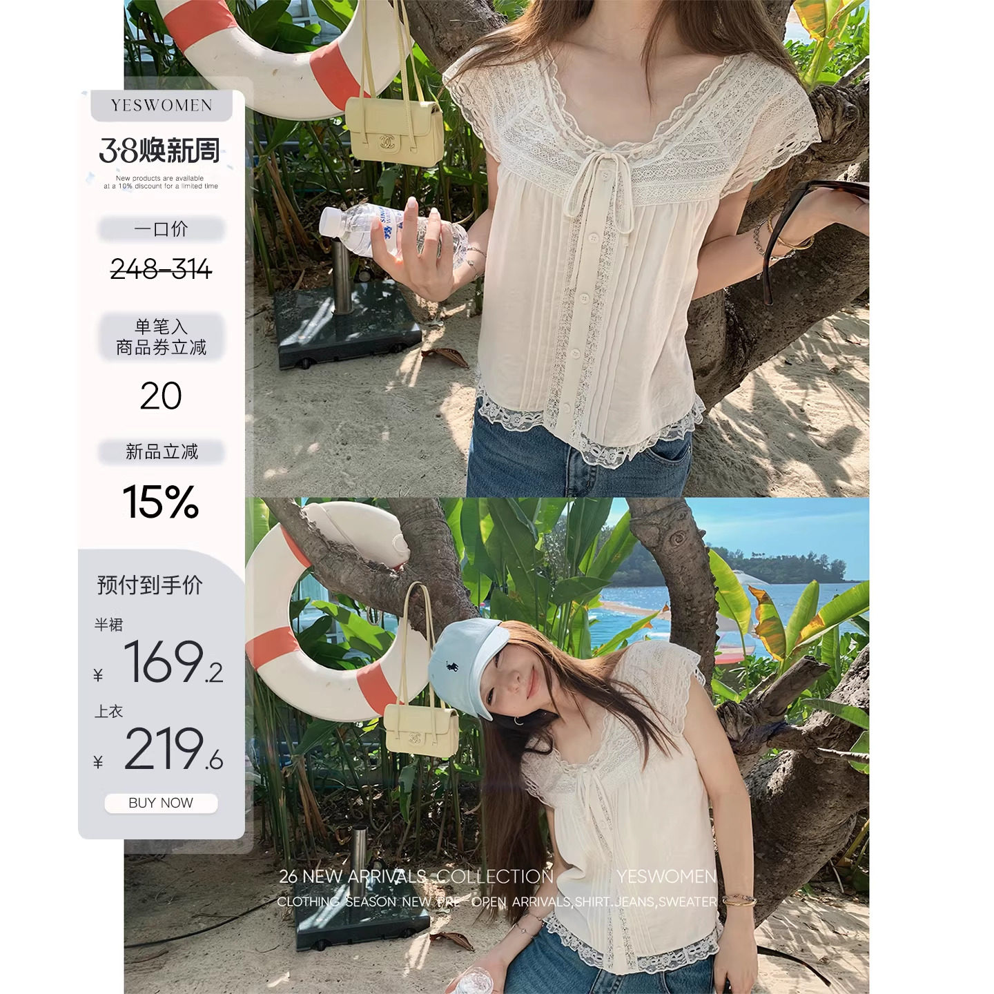 小宜定制 落日海湾·春夏季新款V领绑带蕾丝花边小飞袖衬衫上衣女