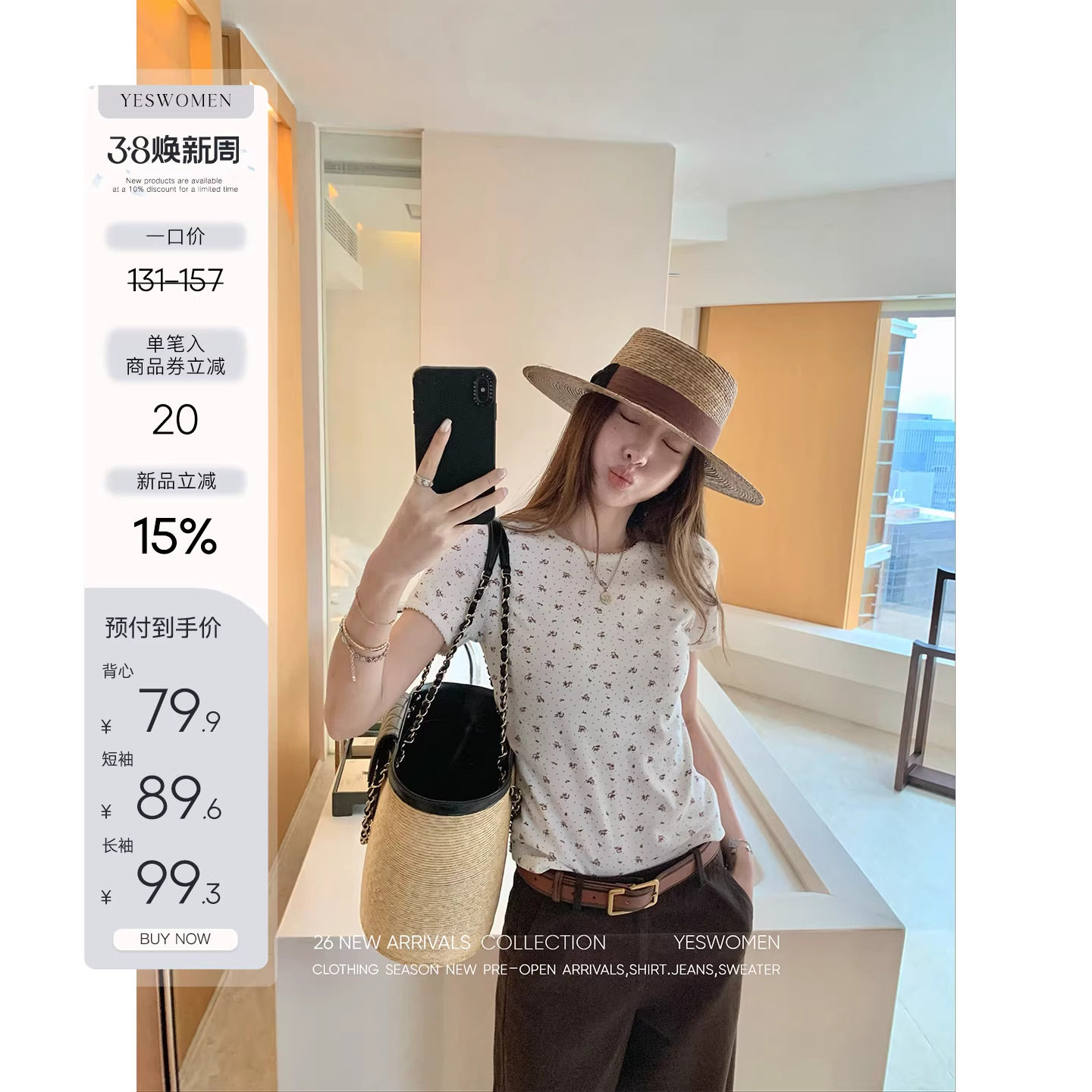 小宜定制 缪系小碎花·韩系圆领吊带短款修身T恤长袖打底衫上衣女