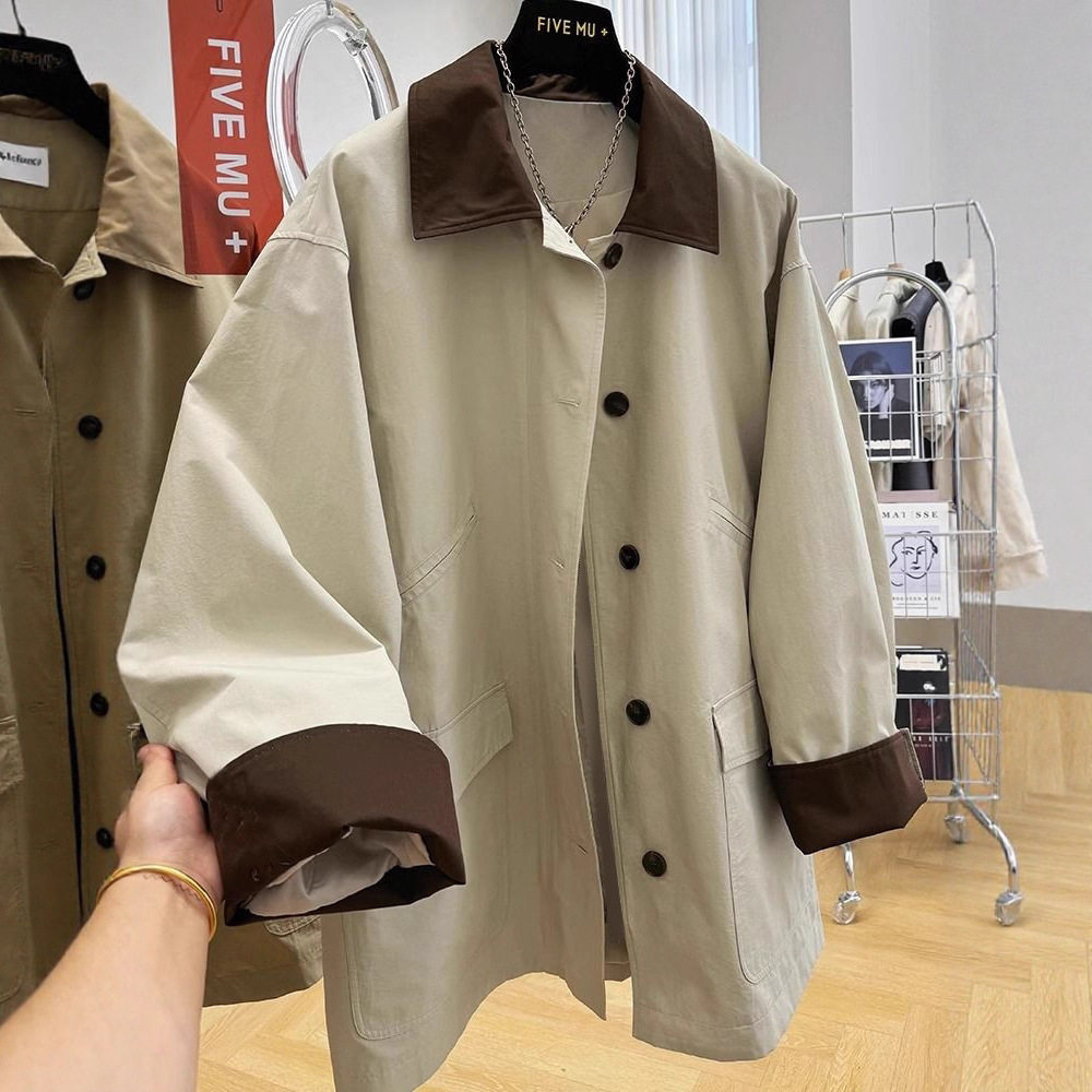 86005D壹韩版袖拼格子工装风衣女2025春装新款宽松立领中长外套女