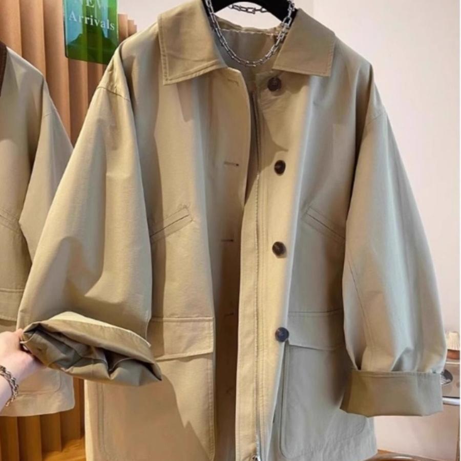 2025秋冬新款宽松显瘦休闲翻领工装风衣女小个子卡其色夹克短外套