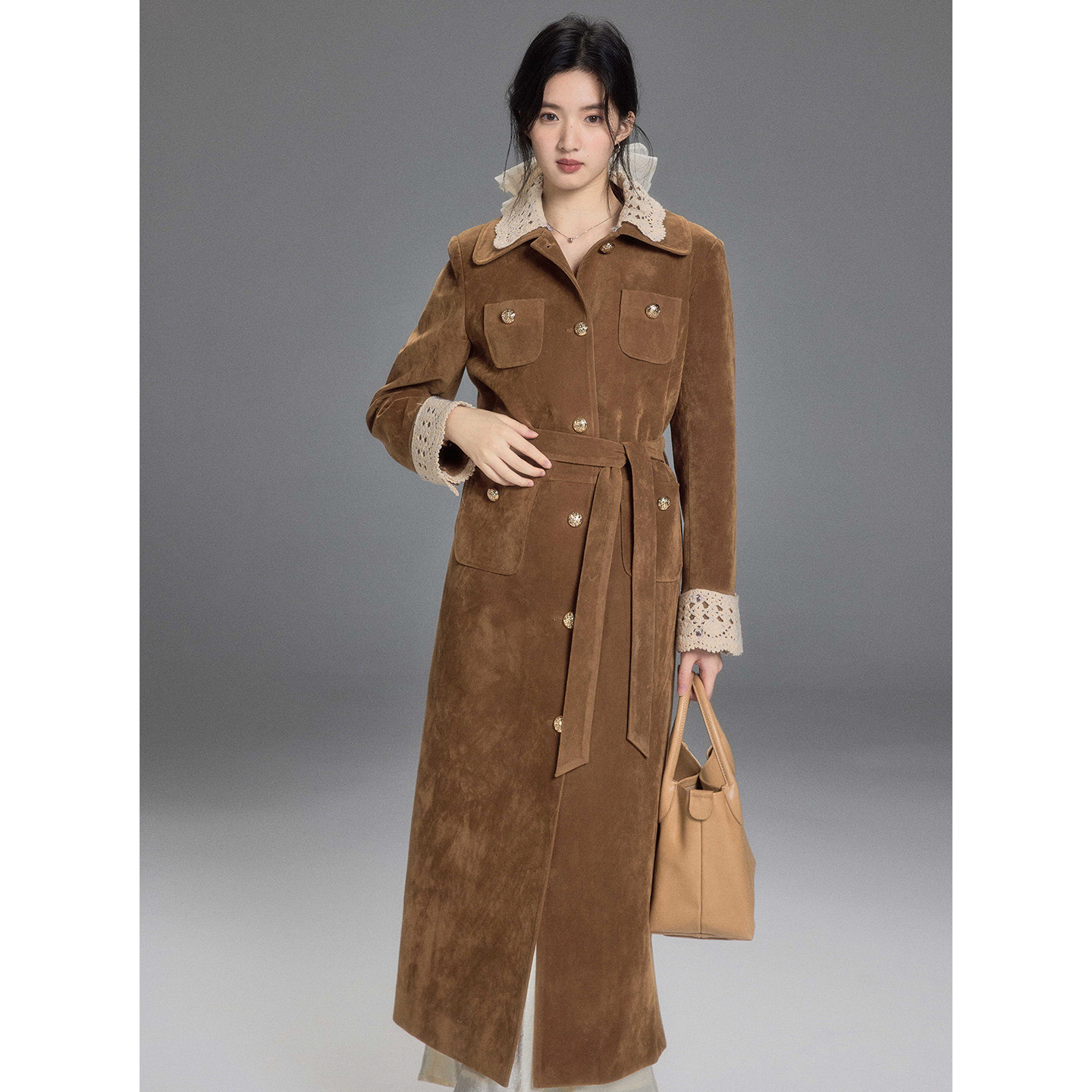 贰羊设计【花漓】可拆花边麂皮工装风衣女冬高级感复古中长款大衣