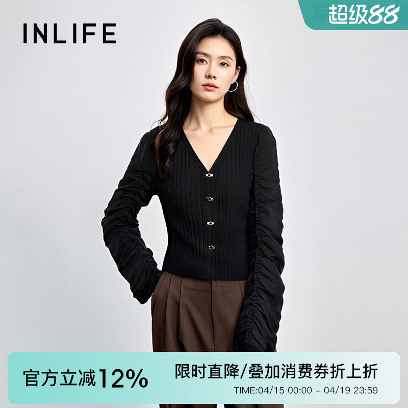 伊纳芙短款v领套头针织衫女2026春季新款时尚修身蕾丝袖拼接毛衫