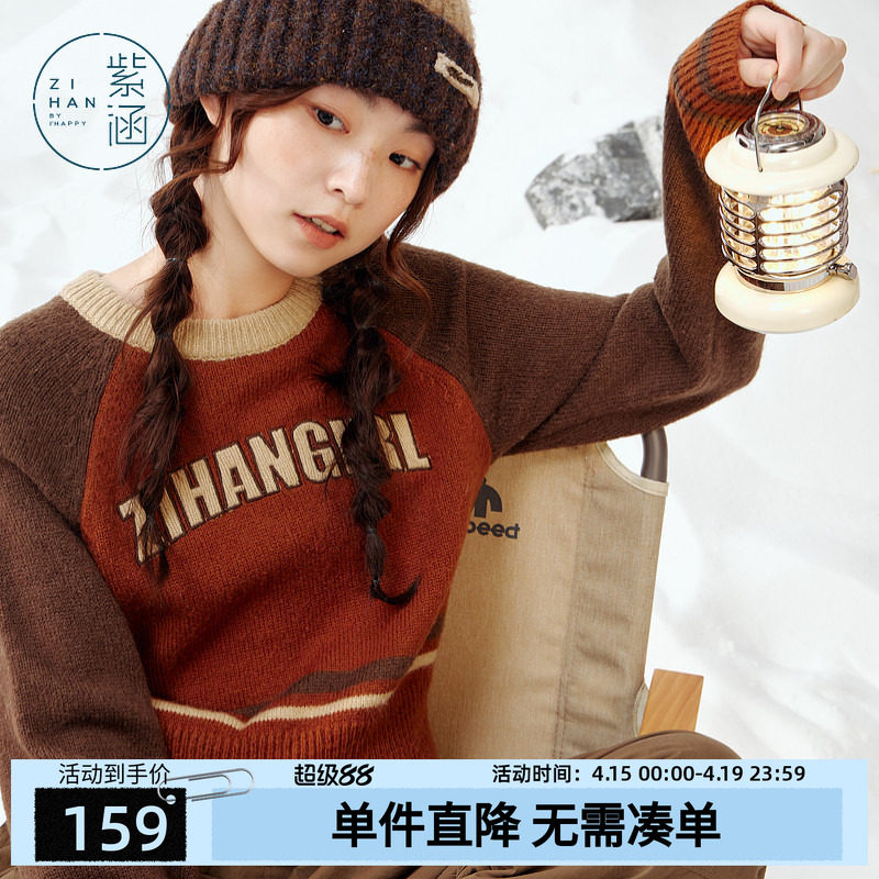 紫涵复古撞色短款圆领针织毛衣女冬季新款修身显瘦套头针织衫上衣