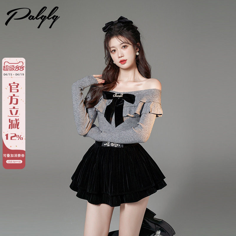 荷叶边套头灰色毛衣女外穿秋冬季2025新款修身短款一字肩针织上衣