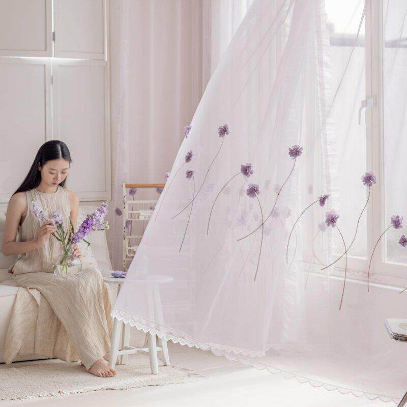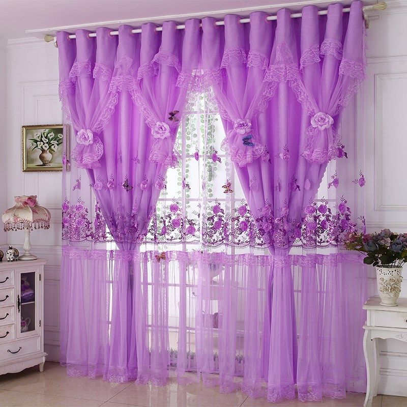 紫色绣花窗帘布料双层韩式田园客厅定制卧室阳台窗纱帘装饰帘成品