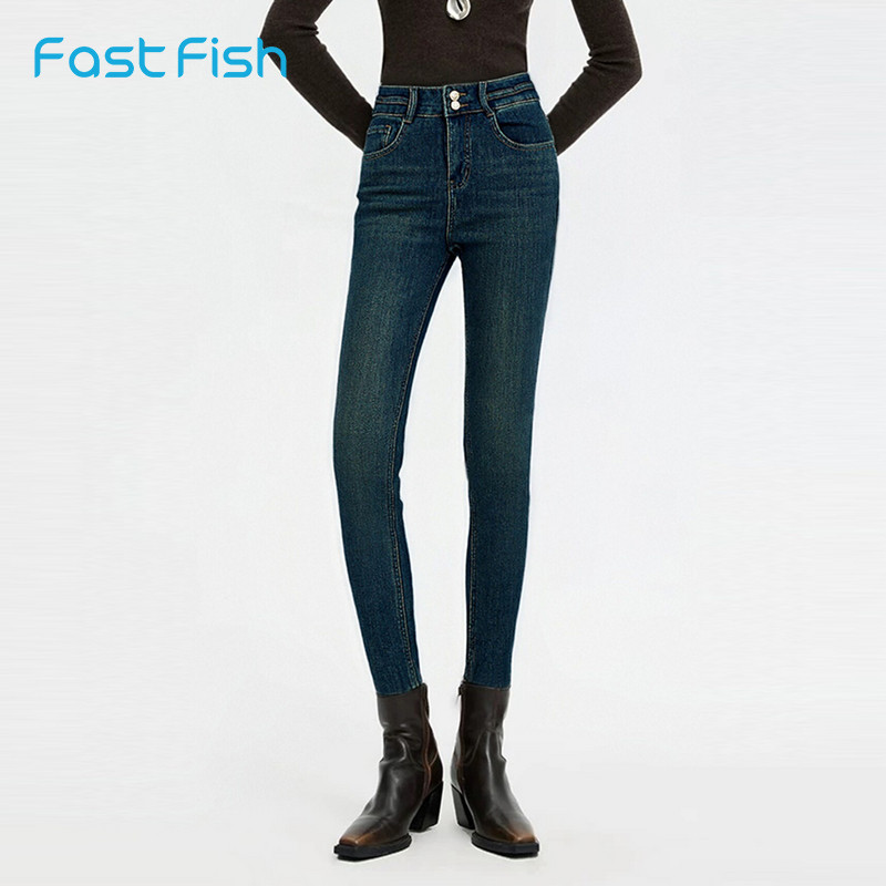 快鱼2025年冬季高腰牛仔裤女小脚紧加绒修身显瘦弹力铅笔裤牛仔裤
