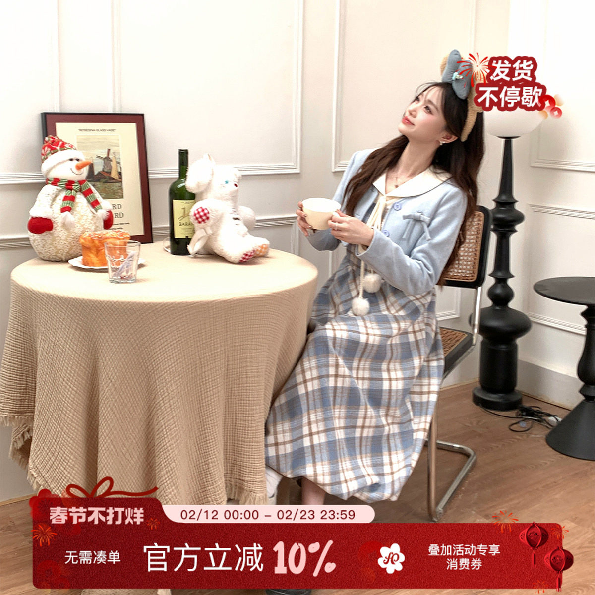 冬日少女感洋装Lolita裙圣诞节毛绒外套拼接红色假两件格纹连衣裙