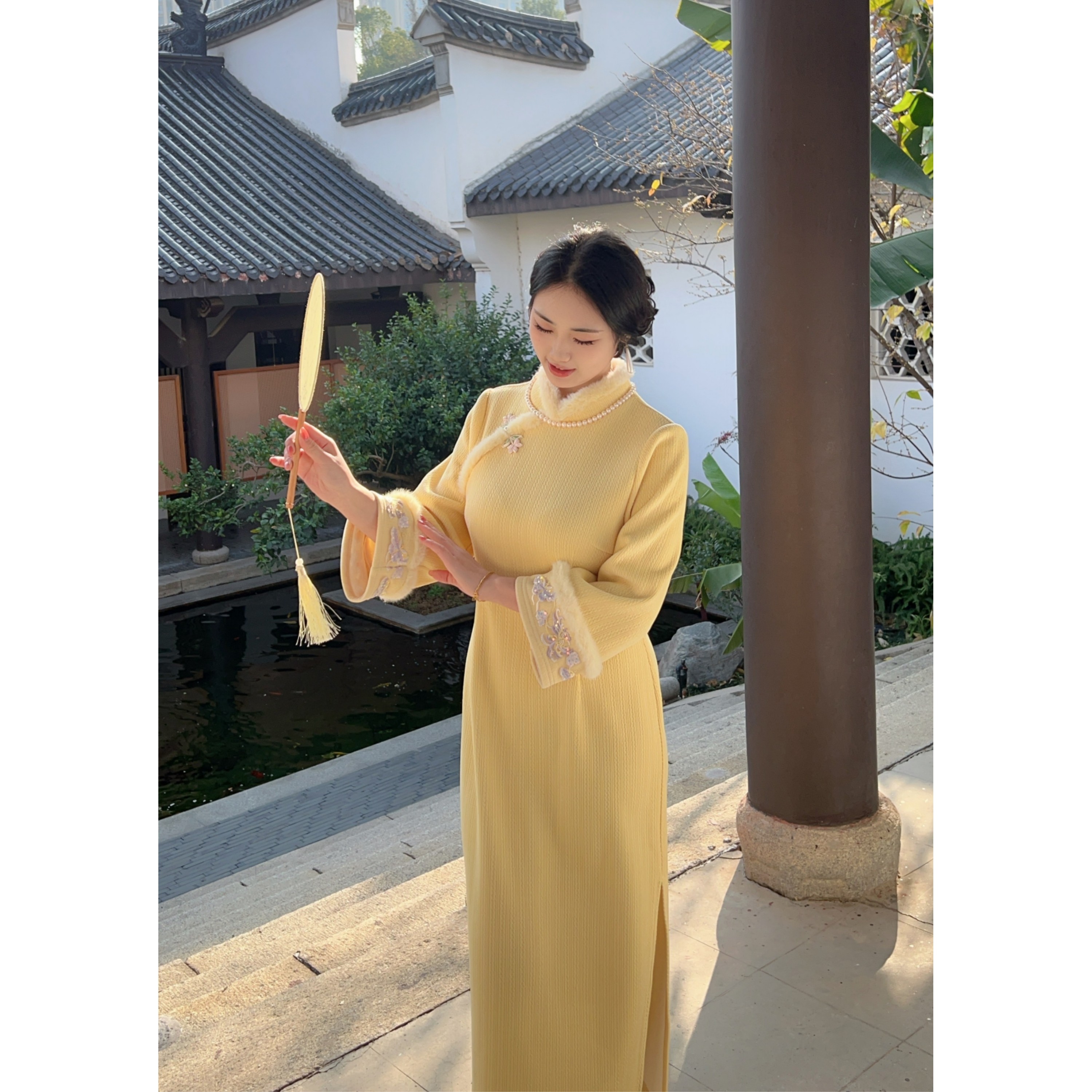 白玉【自制款】黄色少女绣花冬季旗袍保暖加绒大码胖mm气质连衣裙