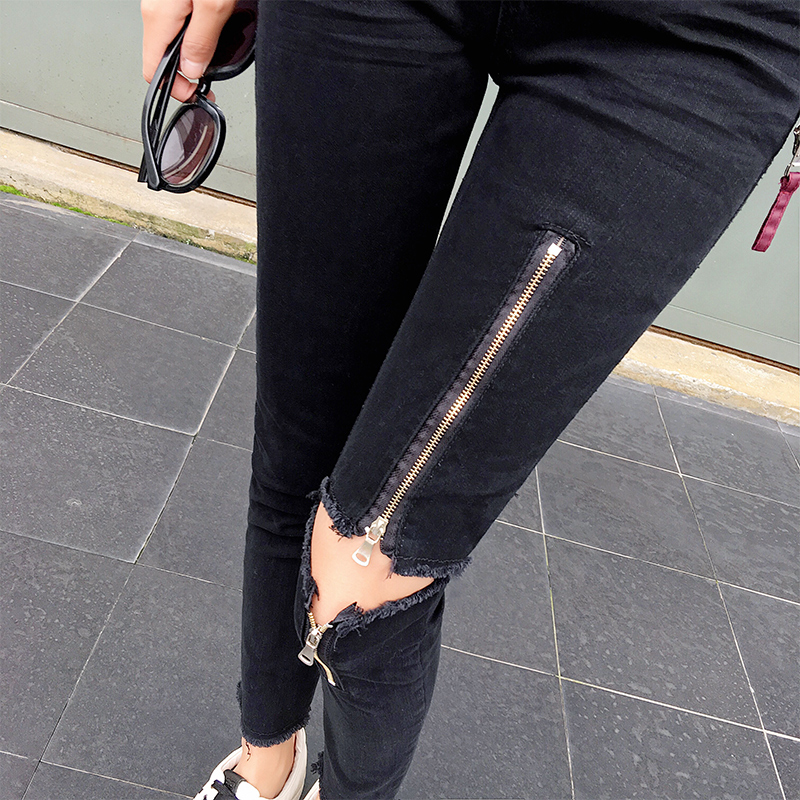 钢铁老爷拉链膝盖破洞牛仔裤女春秋韩版显瘦乞丐裤弹力黑色小脚裤