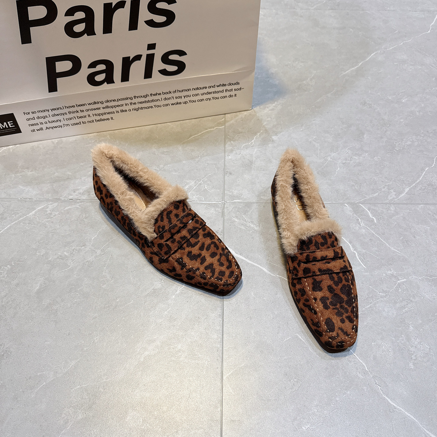 法式复古增高勃肯鞋女冬季加绒保暖棉鞋豹纹方头平底玛丽珍毛毛鞋