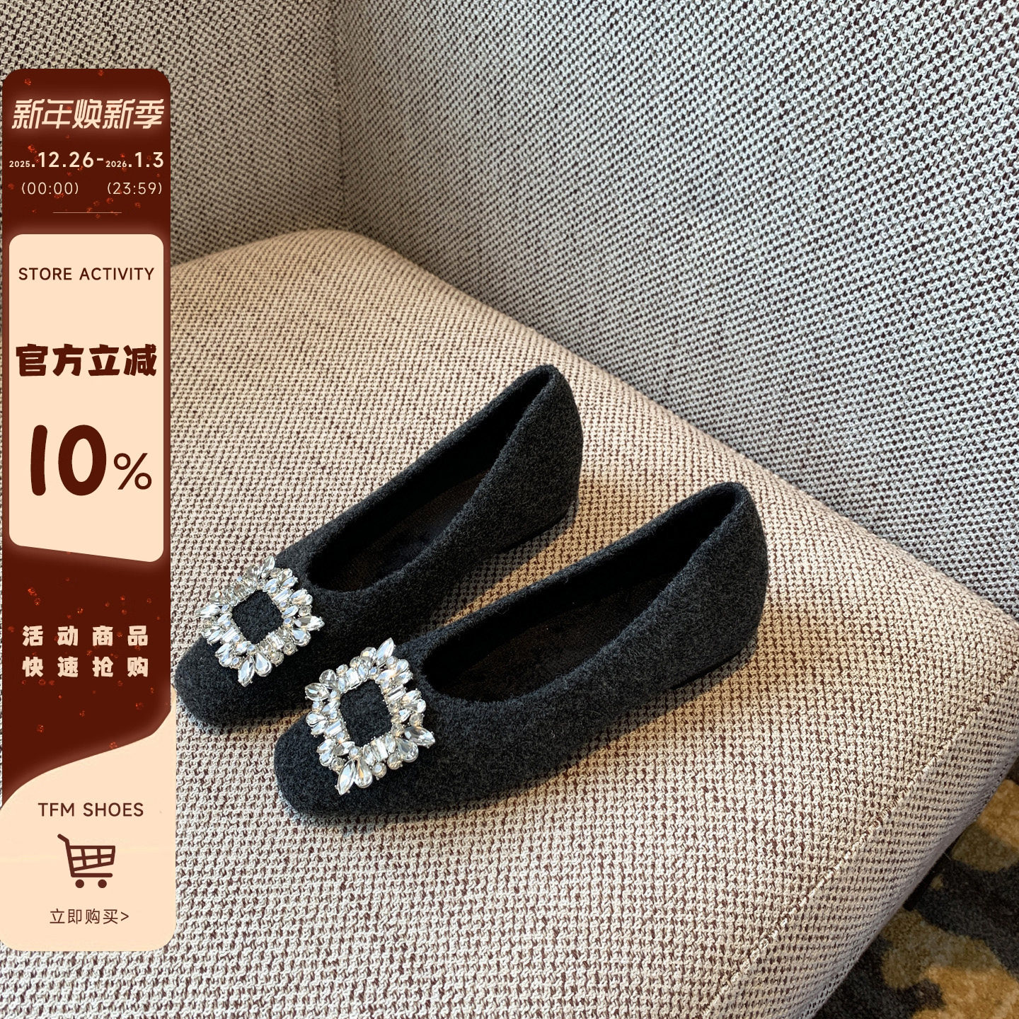 米霏~方头浅口单鞋女冬平底2025新款方扣水钻配裙子瓢鞋大码女鞋