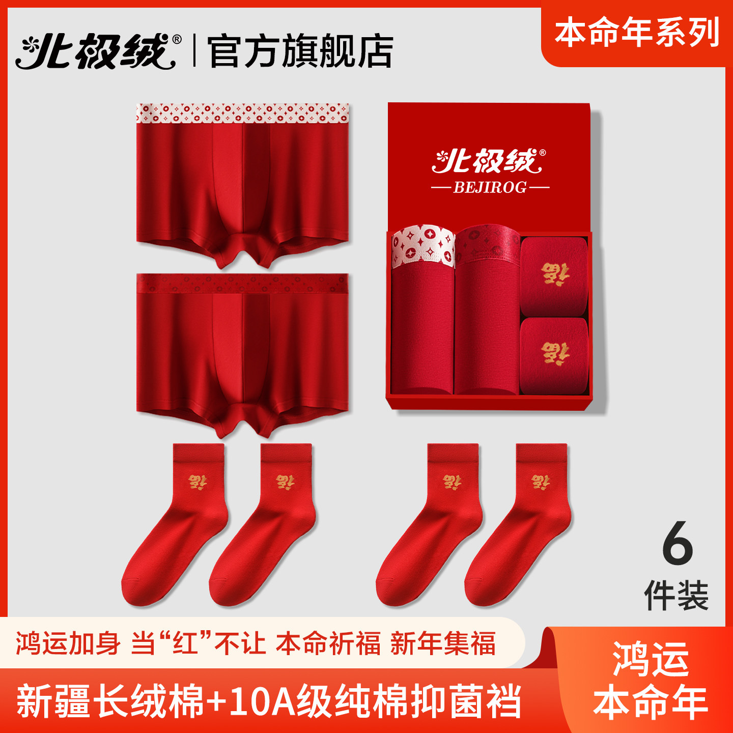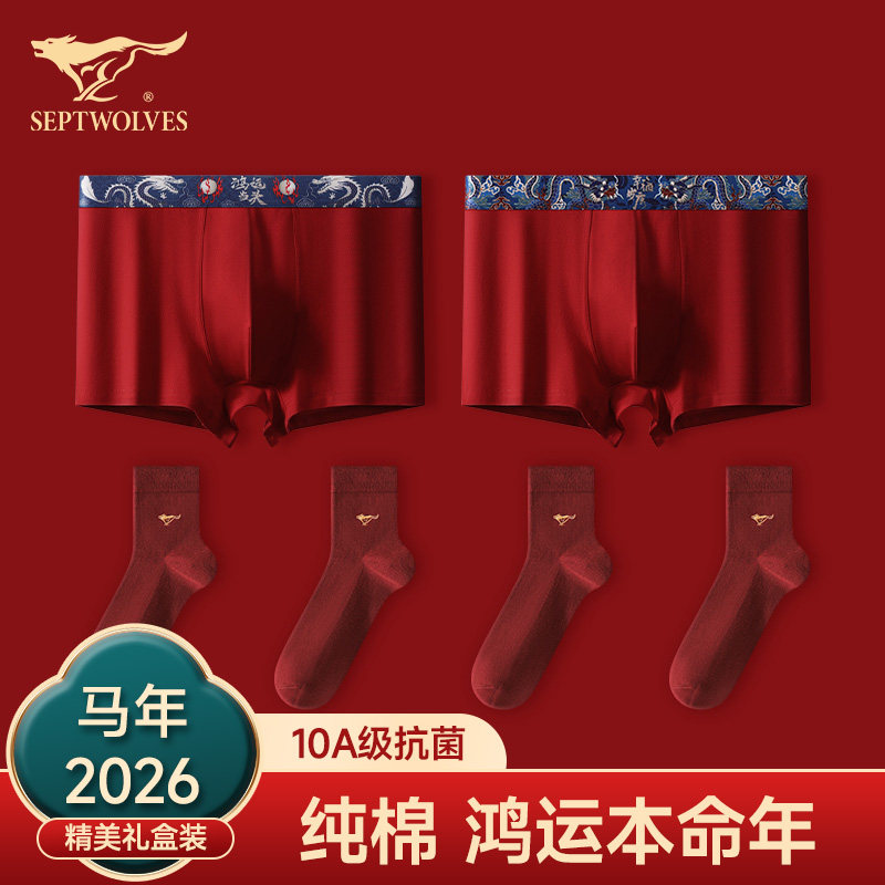 南极人男士内裤本命年红色平角2026新款马年结婚礼物纯棉四角短裤