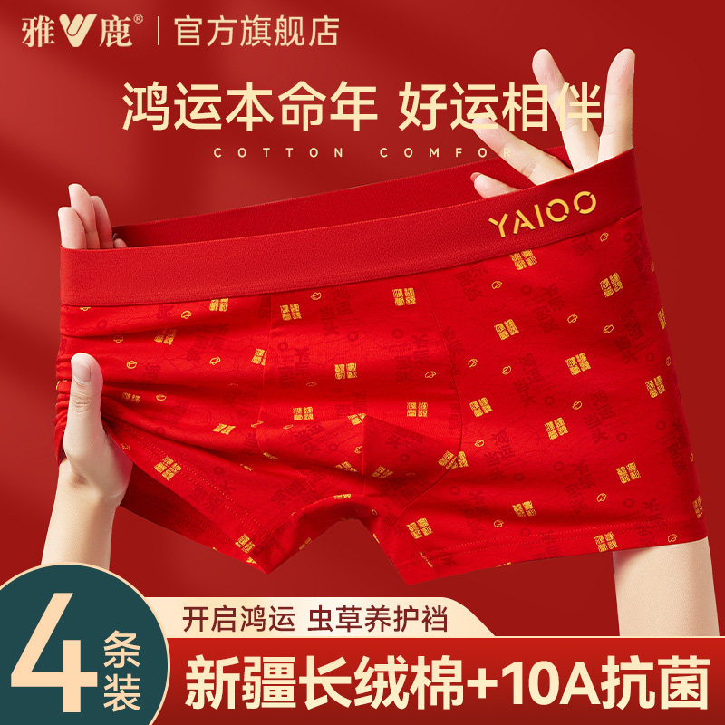 雅鹿男士内裤本命年红色纯棉平角裤男生属马新年结婚礼物四角裤头