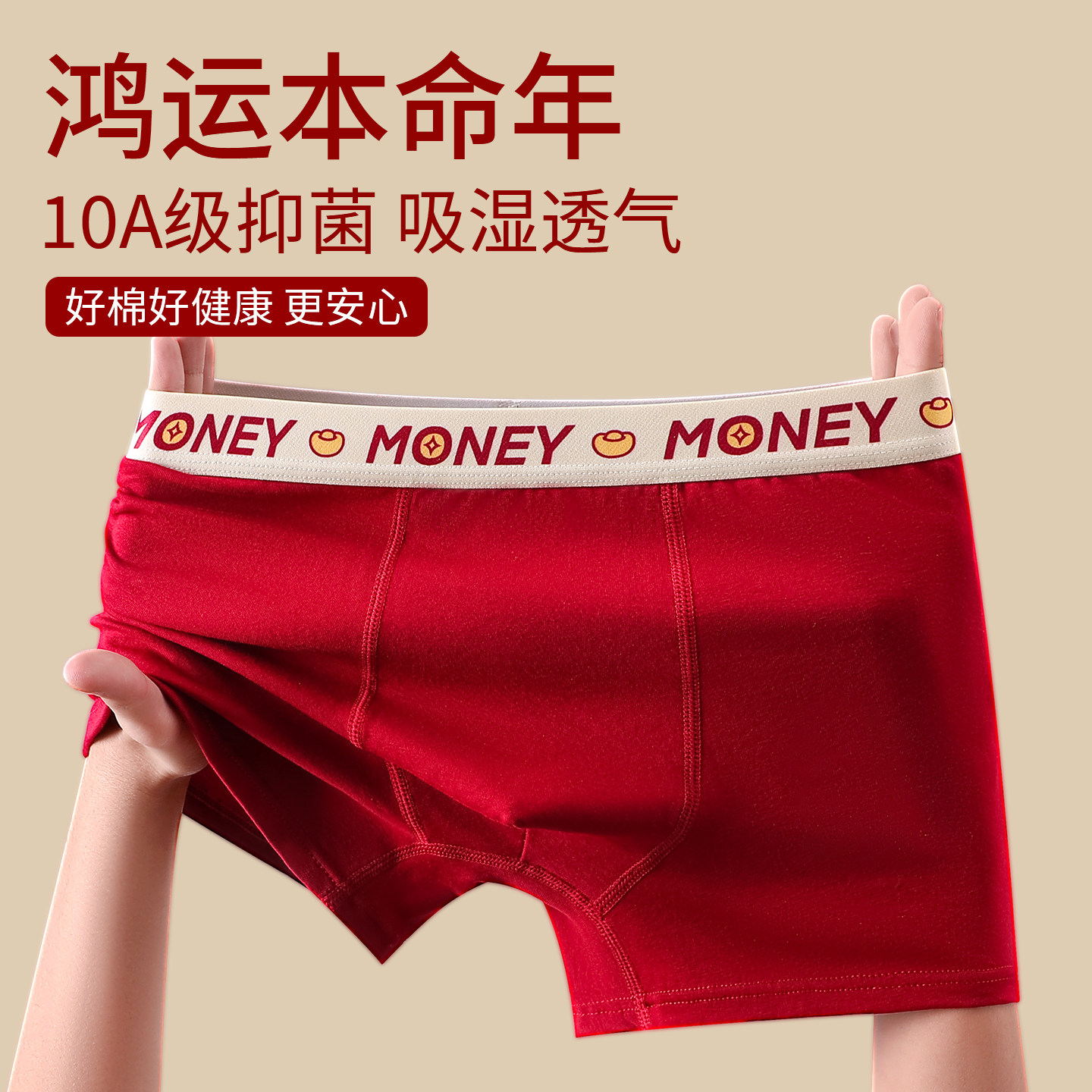 10A抑菌男士内裤本命年红色平角裤舒适透气纯棉四角裤头新年礼物