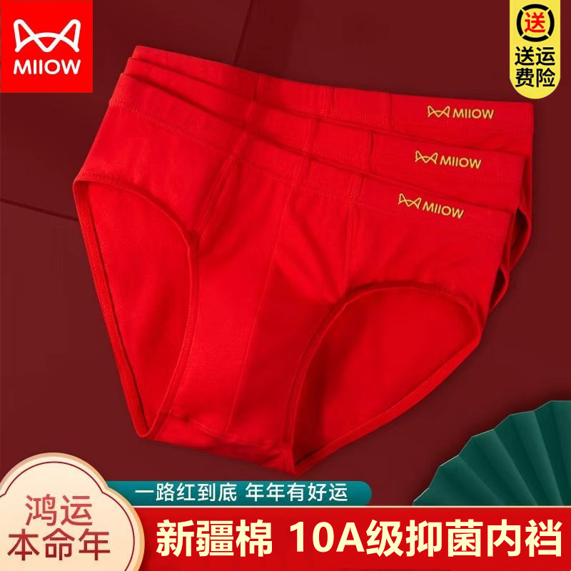 猫人男士内裤本命年红色纯棉抗菌透气三角裤男性感结婚运动短裤头