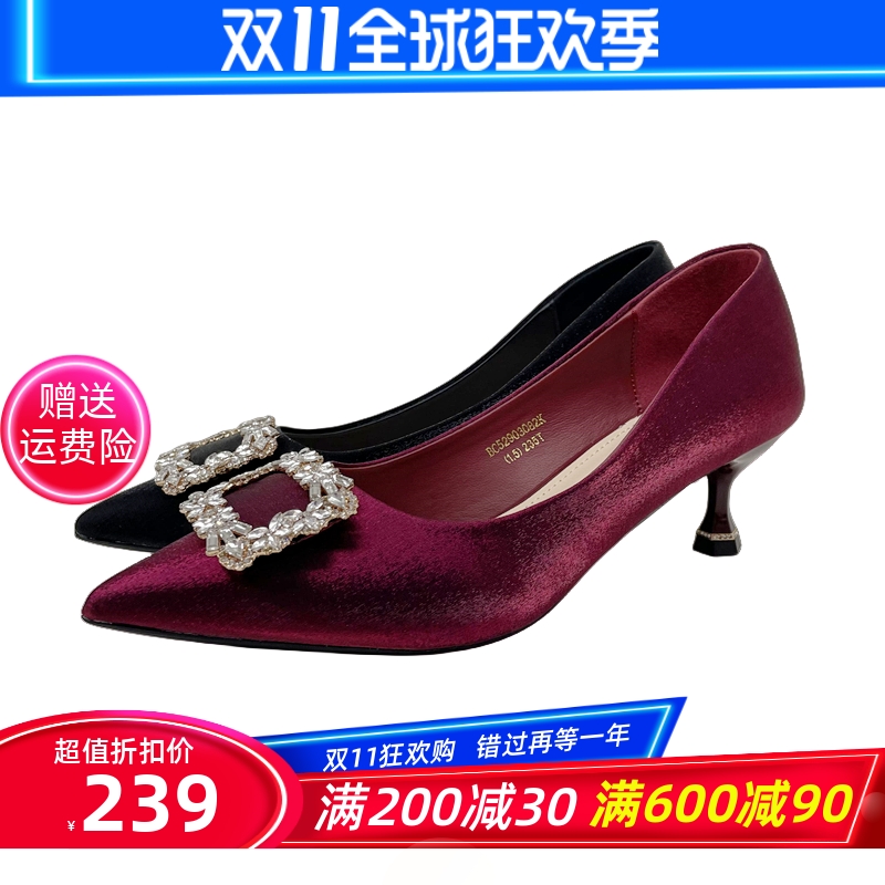 红蜻蜓女单鞋细跟小猫跟尖头通勤高跟婚鞋红鞋新娘鞋BC52903082K