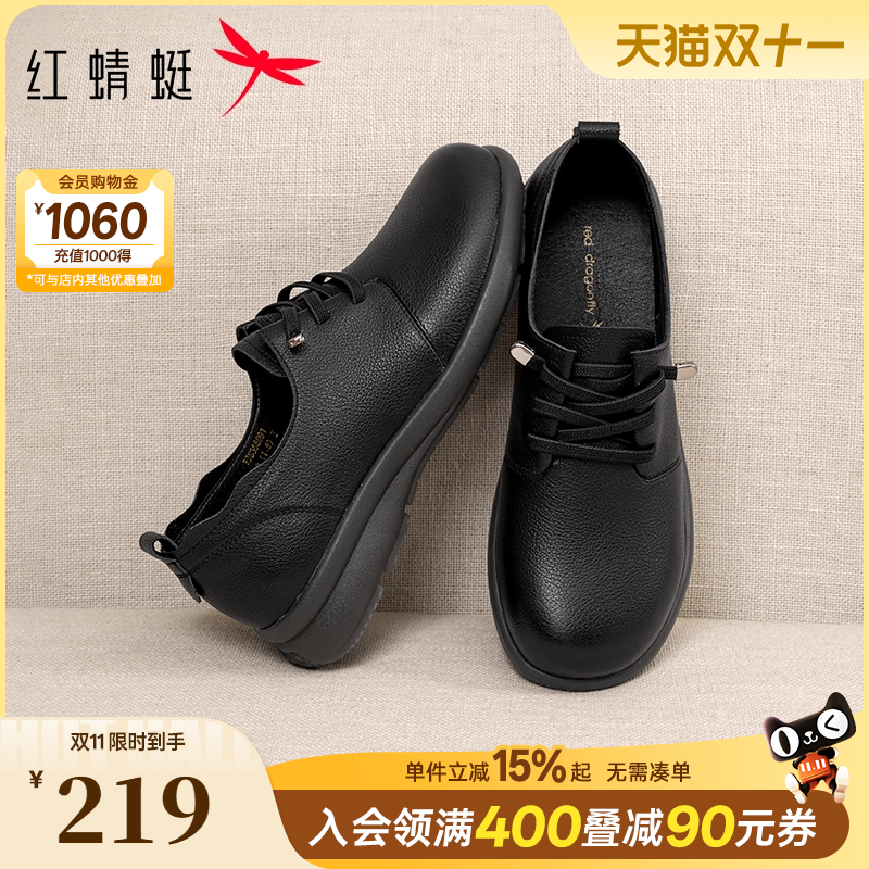 红蜻蜓皮鞋女妈妈鞋2025秋季新款女鞋平底单鞋真皮软底中老年鞋子