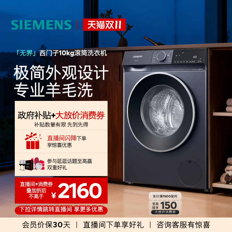 西门子10公斤智能除渍羊毛洗滚筒洗衣机家用大容量全自动变频1U10