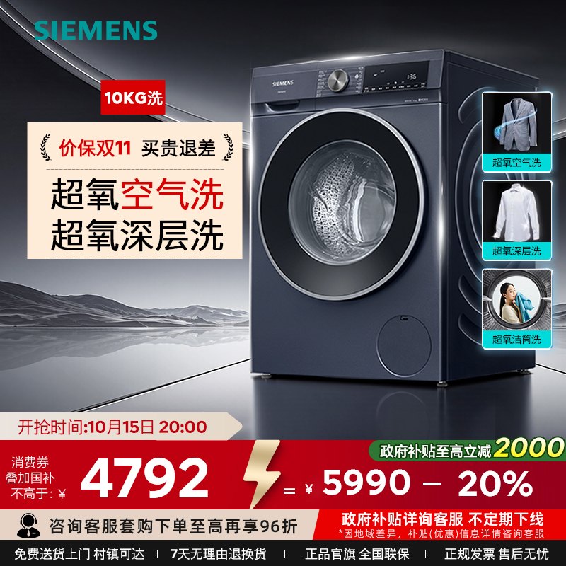 【蓝宝石超氧智投】西门子10公斤滚筒全自动洗衣机官方变频5C10