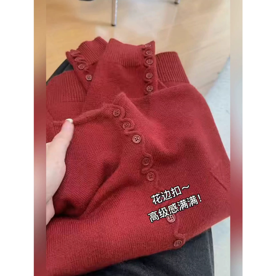 韩版时尚半高领提花纽扣针织衫女秋冬宽松加厚毛衣软糯打底衫毛衣