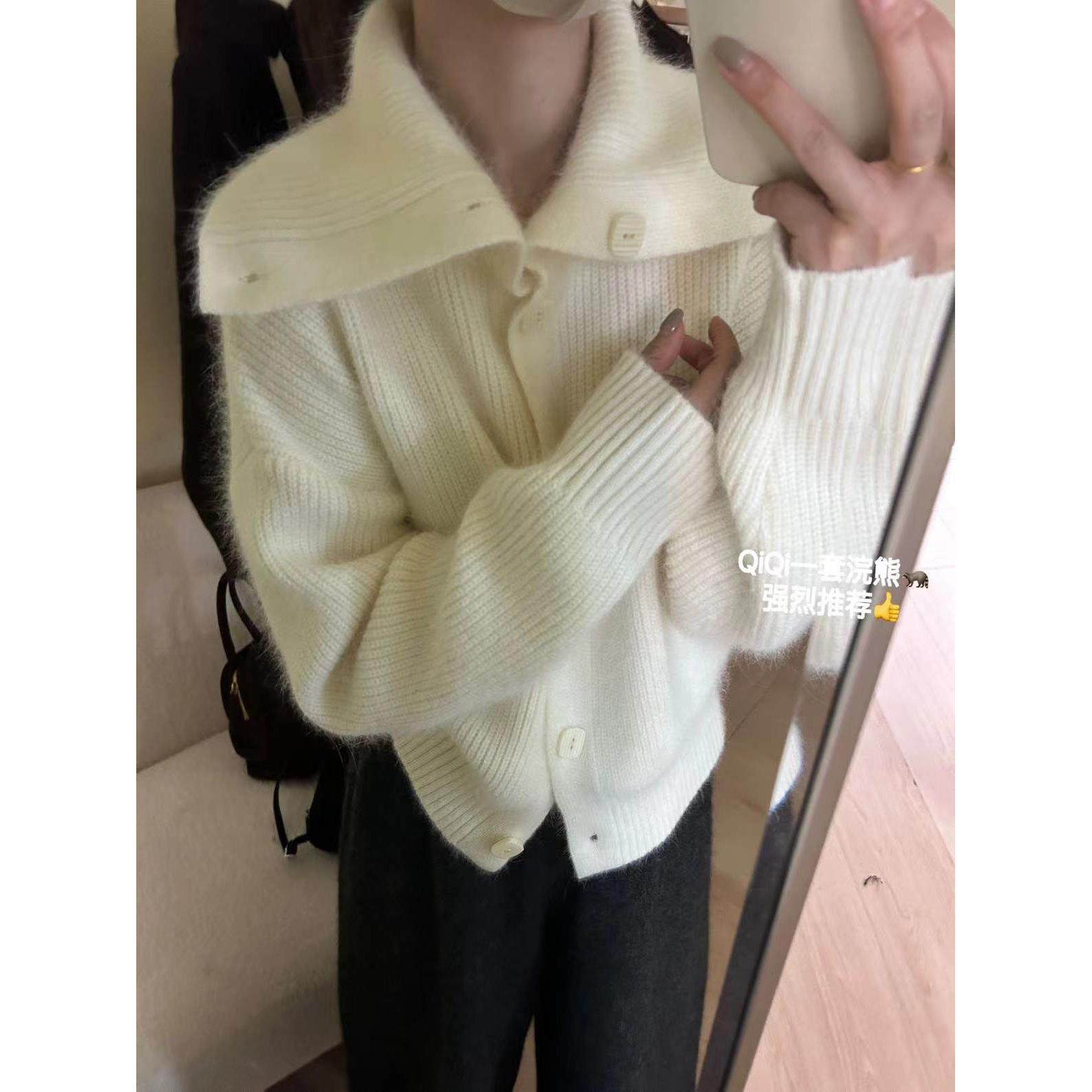 氛围感!慵懒风白色V领毛衣开衫女冬季新款韩版宽松针织衫外套潮