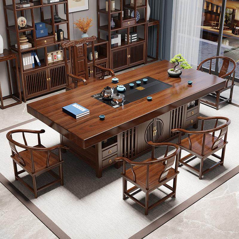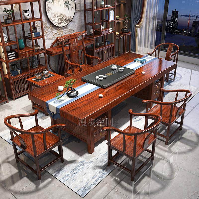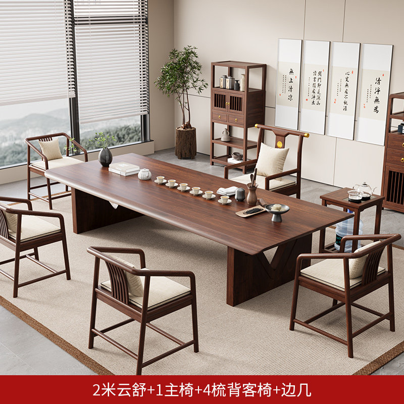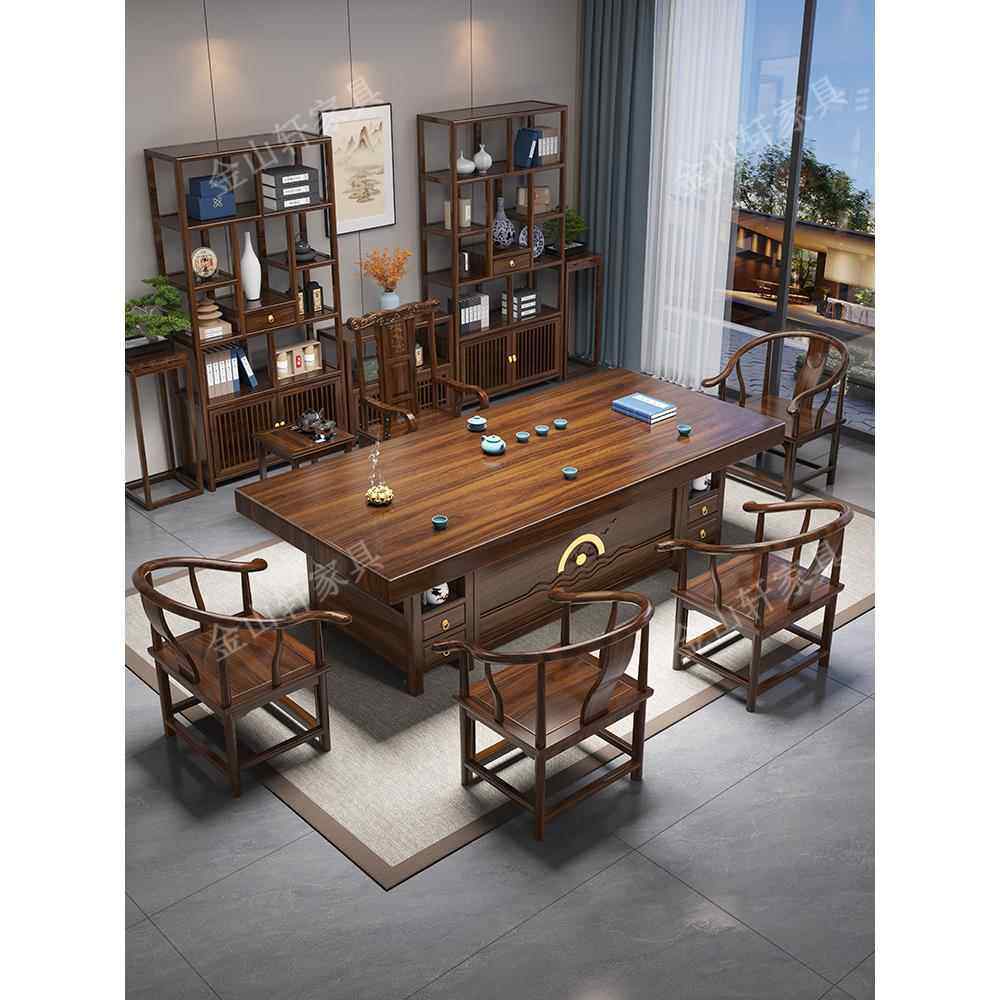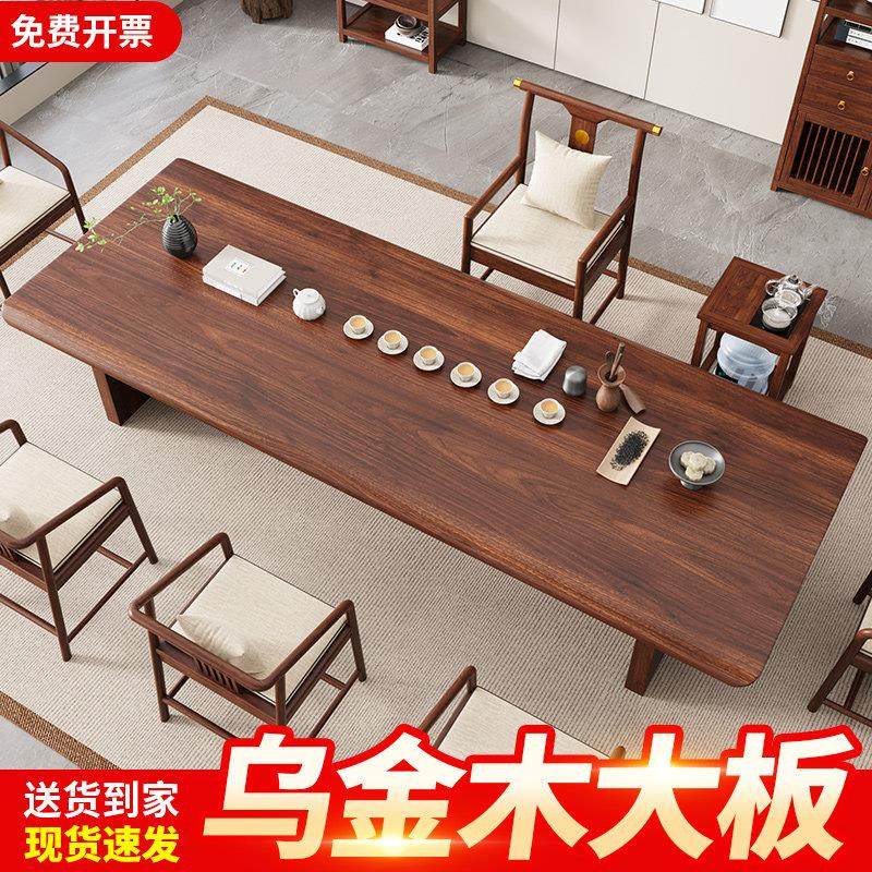 新中式乌金木原木大板茶桌椅组合办公室家用实木茶几茶台一桌五椅