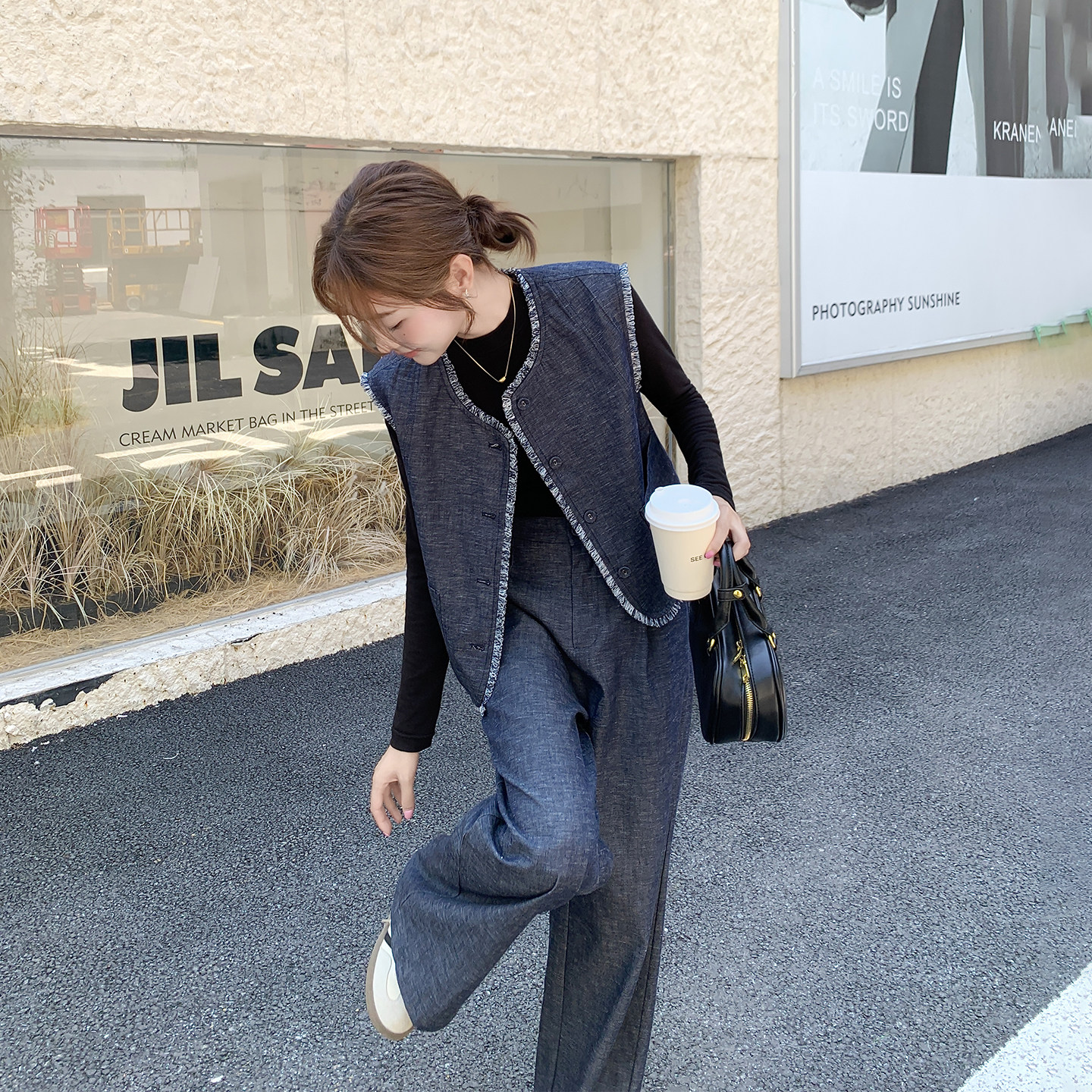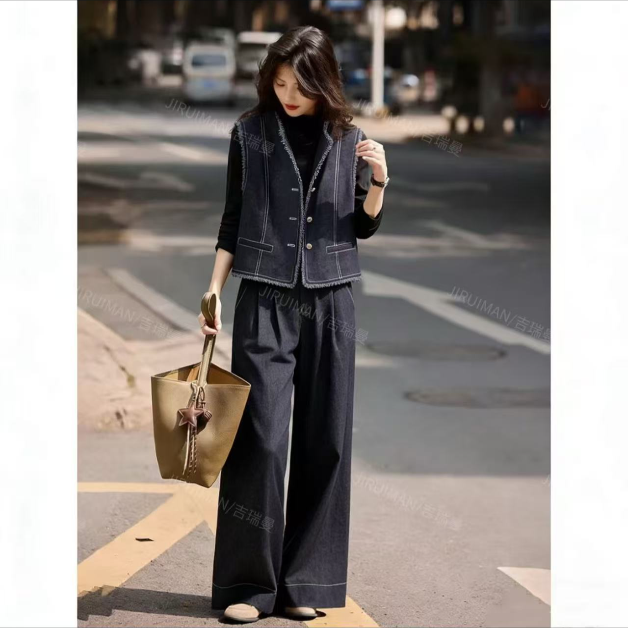 1101 春秋款时尚休闲流苏毛边牛仔马甲打底衫阔腿裤三件套套装MAN