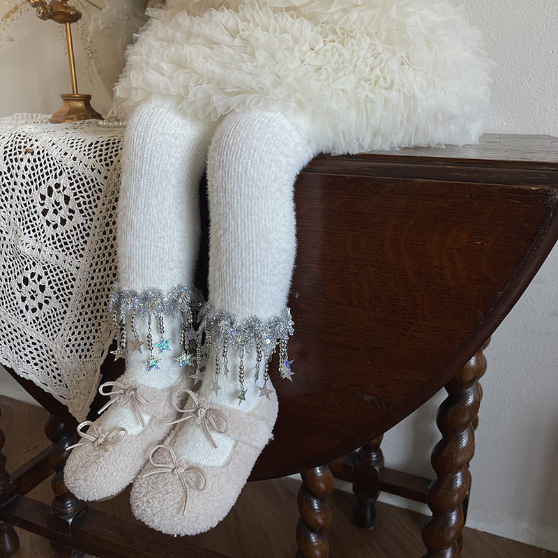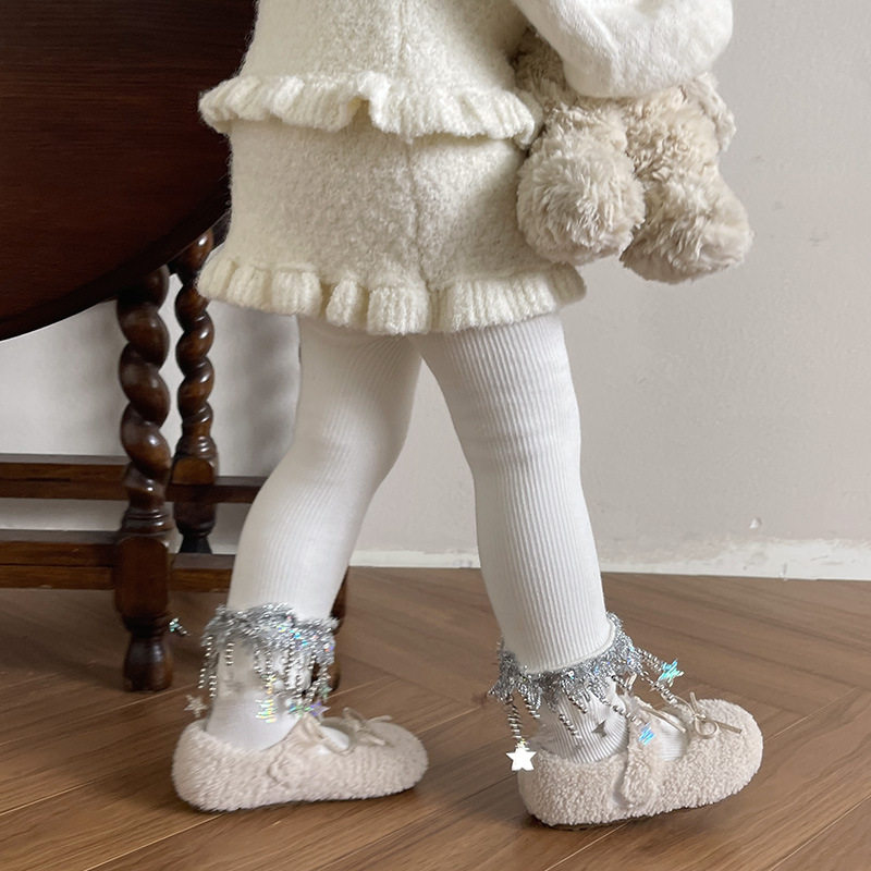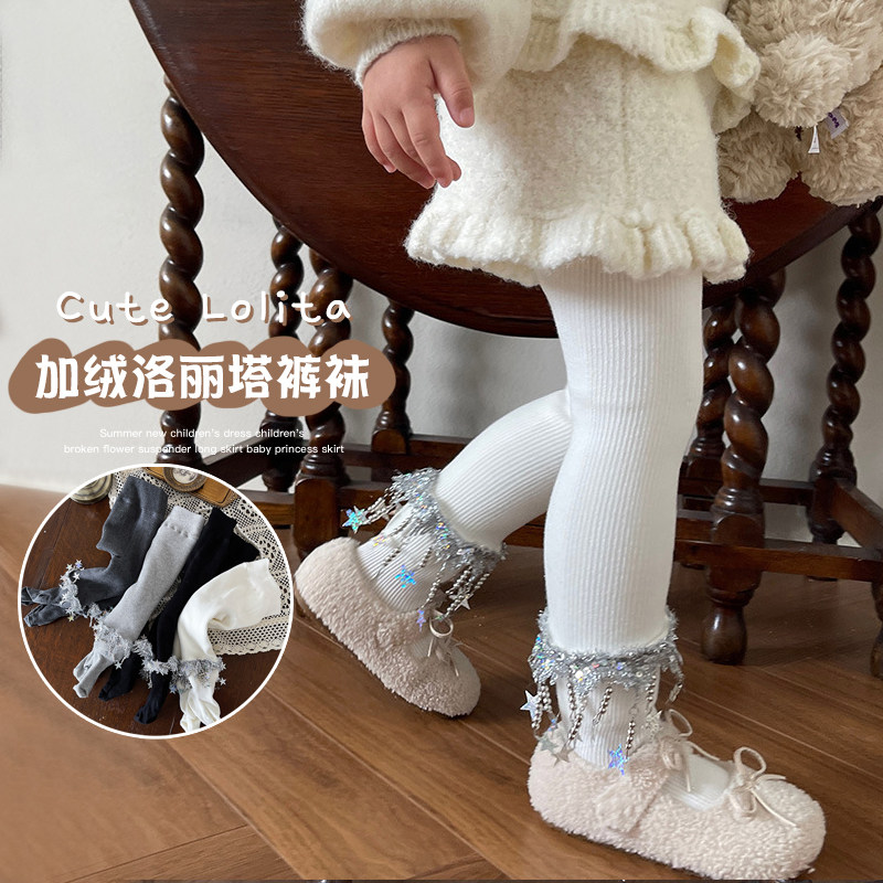 熙熙妈女童冬季加绒加厚连裤袜洛丽塔亮片星星流苏袜儿童打底裤袜