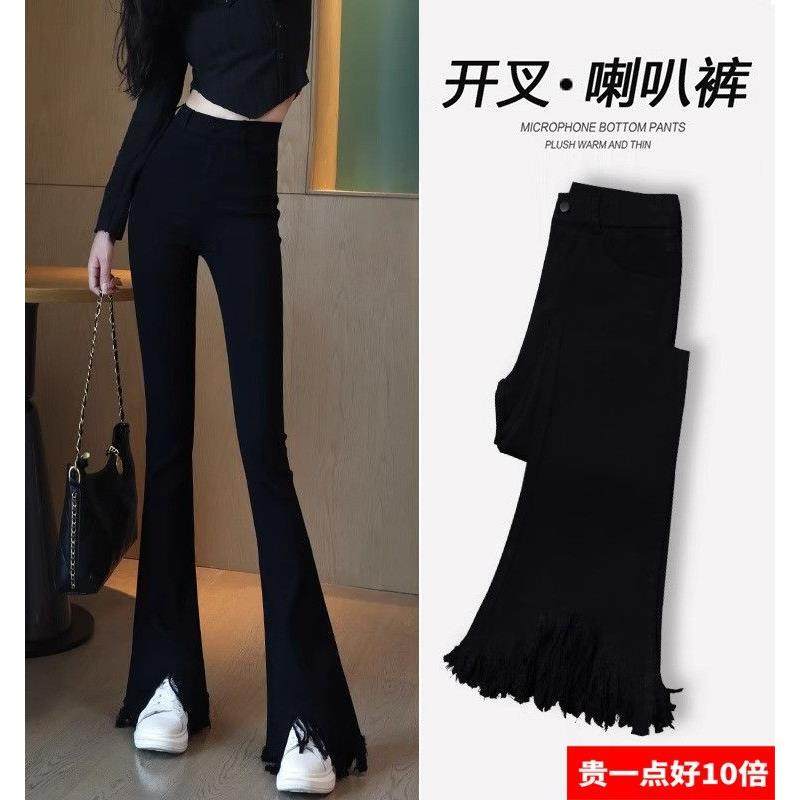 黑色开叉微喇叭裤女春秋高腰收腹显瘦流苏毛边打底裤加绒微喇长裤